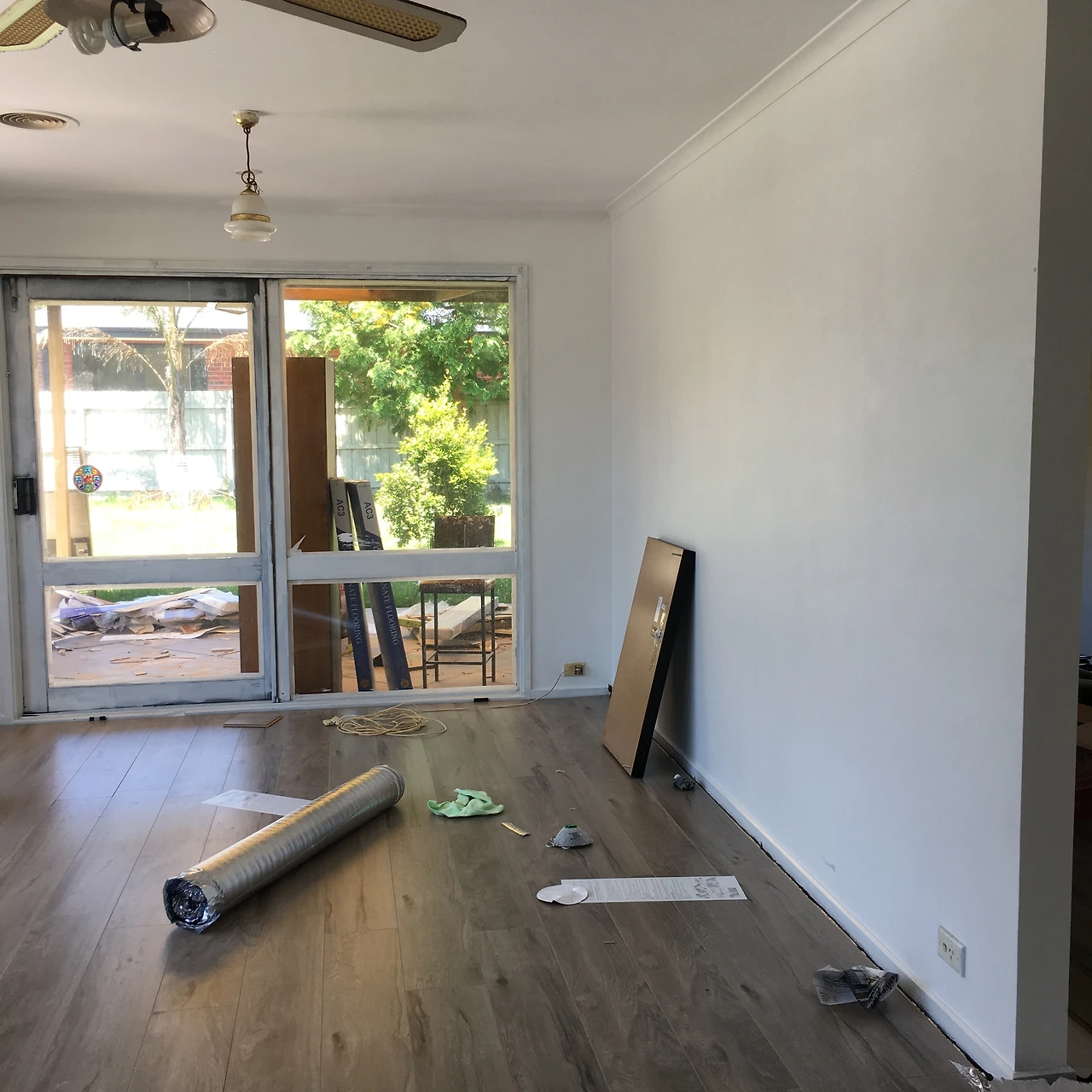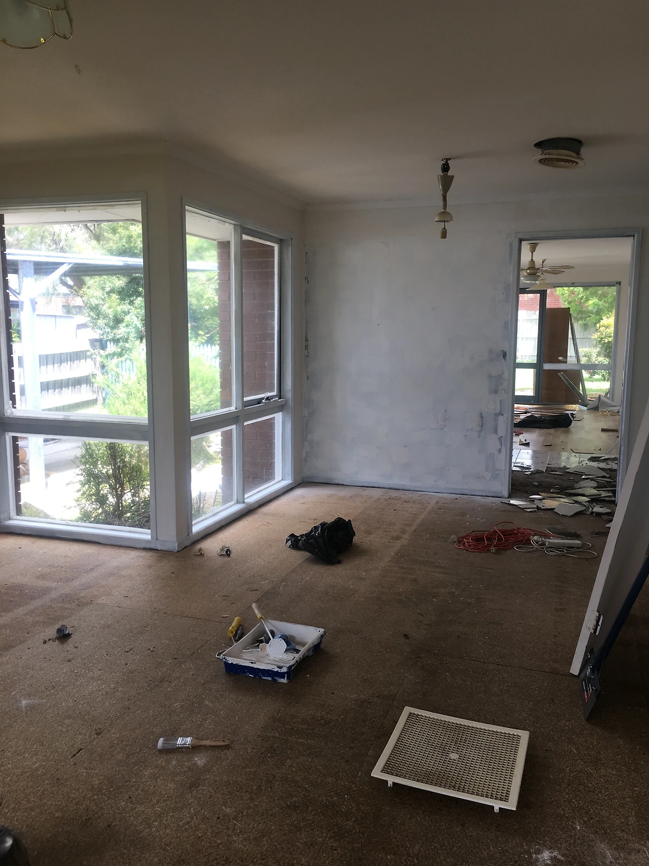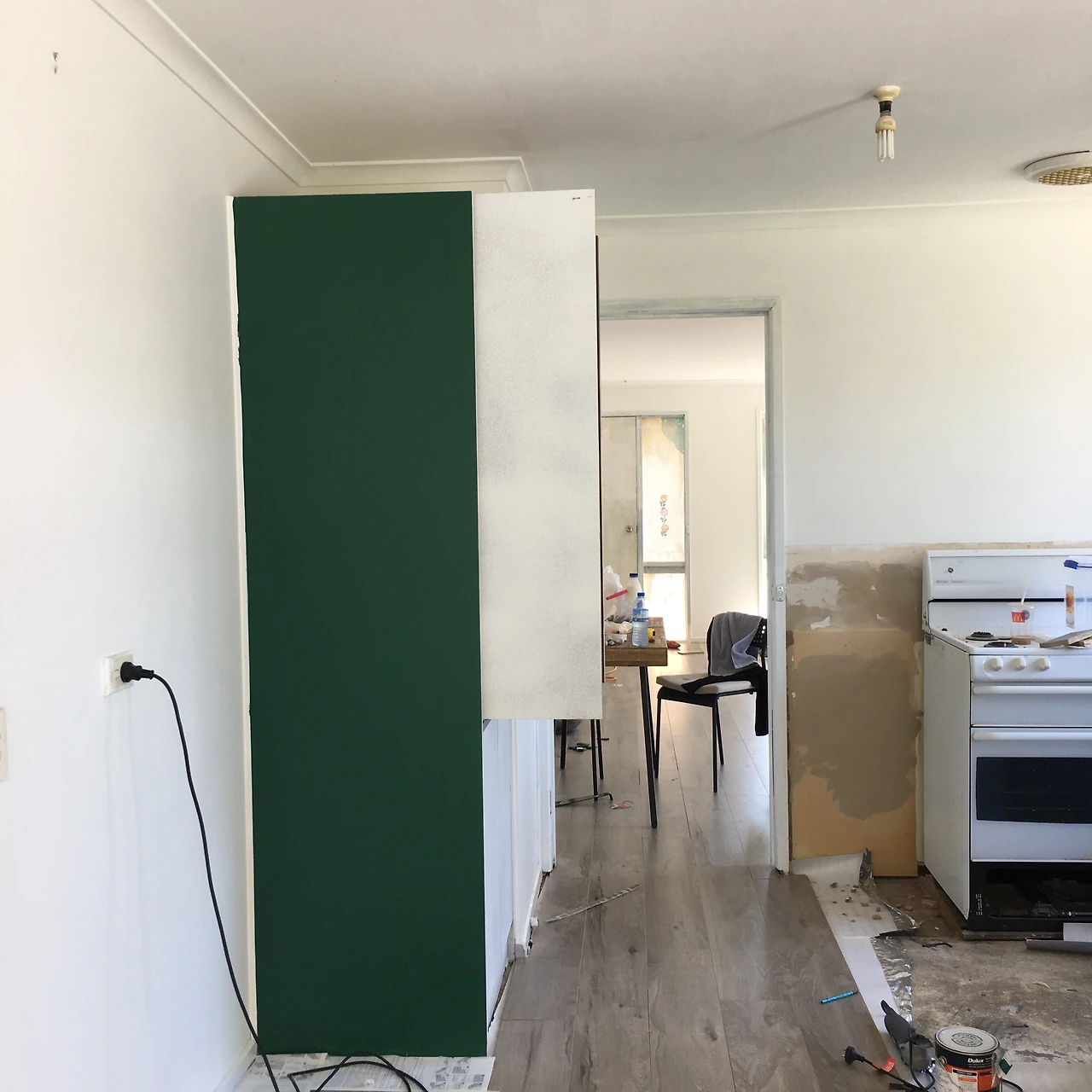 거실과 부엌 그리고 반대편 거실 공간까지 바닥을 다 깔았다. 이제 공사현장에서 조금은 집이 된 거 같다. 침대를 펴고 잠을 청할 수가 있다니! 냉장고에서 시원한 물을 꺼내 먹을 수 있다니!