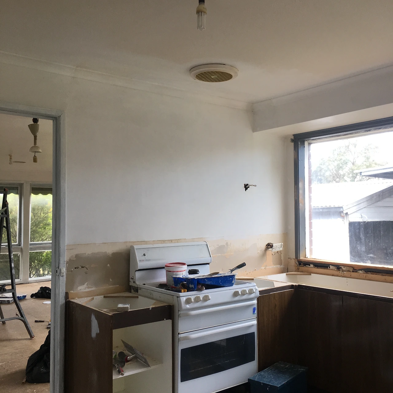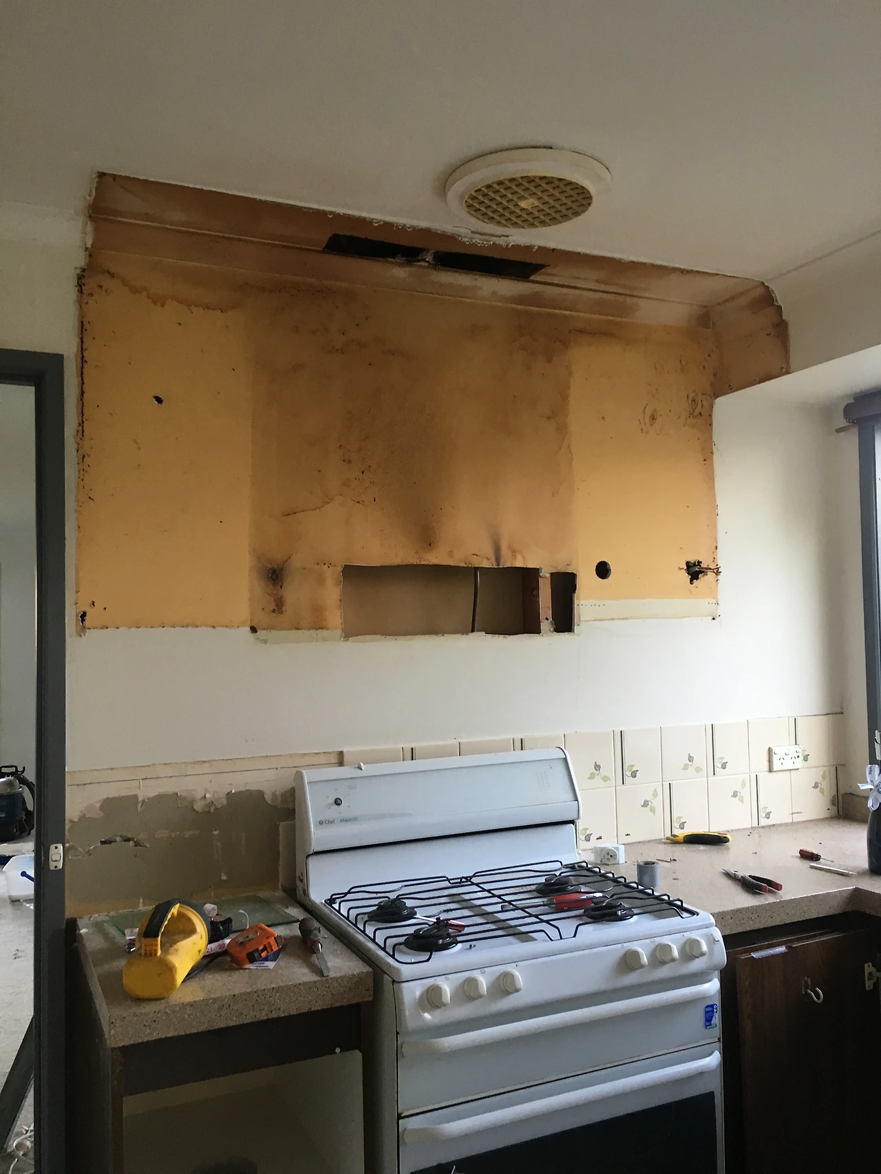 먼저 정말 문제가 많았던 부엌. 돈도 가장 많이 들어갔고, 손도 제일 많이 갔다. 할아버지 혼자서 살았던 집이라 그런지 부엌에 전혀 욕심을 부린 흔적이 없다. 모든 것이 처음 집을 지었을 때 했던 옵션 그대로였고 당연히 수납도 성치 않았다. 부엌 벤치탑도 많이 삭았고 재질도 썩 마음에 들지 않았다. 여기 위에서는 썩은 양파도 썰고 싶지 않았다. 가스레인지는 그냥 스쳐 봐도 오래돼서 오븐은 열어보지도 않았다. 싱크대는 그냥 노멀 한 2구짜리 스테인리스 싱크대였지만... 역시나 바꾸고 싶었다. 가장 문제는 아래 사진에 보이는 저 누런 벽이었다. 상부장에 달려있던 후드가 제기능을 상실했는지 어쨌는지 온 기름때가 벽으로 다 흡수되었다. 철거하고 나니 경악할 것들이 수줍게 하나, 둘 숫자를 세며 올라오는 게 아니라 파노라마처럼 웅장하게 등장했다.