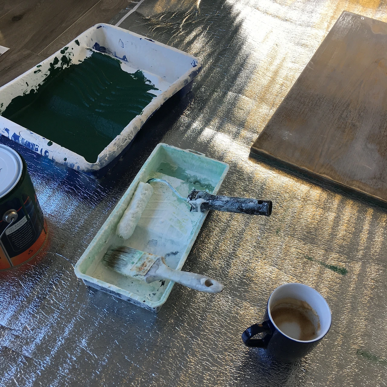 이제 굵직한 큰 일은 끝낸 듯했다. 가볍게 커피도 곁들이며 수납장 페인트 칠을 시작했다. 이것 역시 하얀색 베이스 페인트를 먼저 올린 뒤 색을 올려야 한다. 그래서 셀프 인테리어는 늘 내 생각보다 두배의 금액 두배의 시간이 걸리나보다. 수납장 문도 일일이 떼어내야 하고 뒤집어 말리고 다시 칠하고. 다 마른 뒤 문을 달아주어야 한다. 하다 보니 제일 마지막에 칠한 문은 거의 발로 칠한 듯 형편이 없지만, 나는 눈을 질끈 감기로 한다.