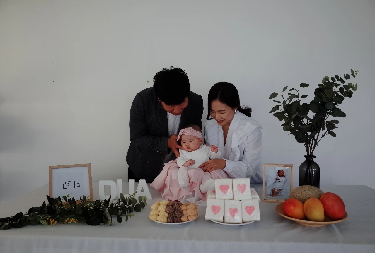 나와 남편 그리고 두아. 이렇게 셋이서 두아의 백일을 축하했다.