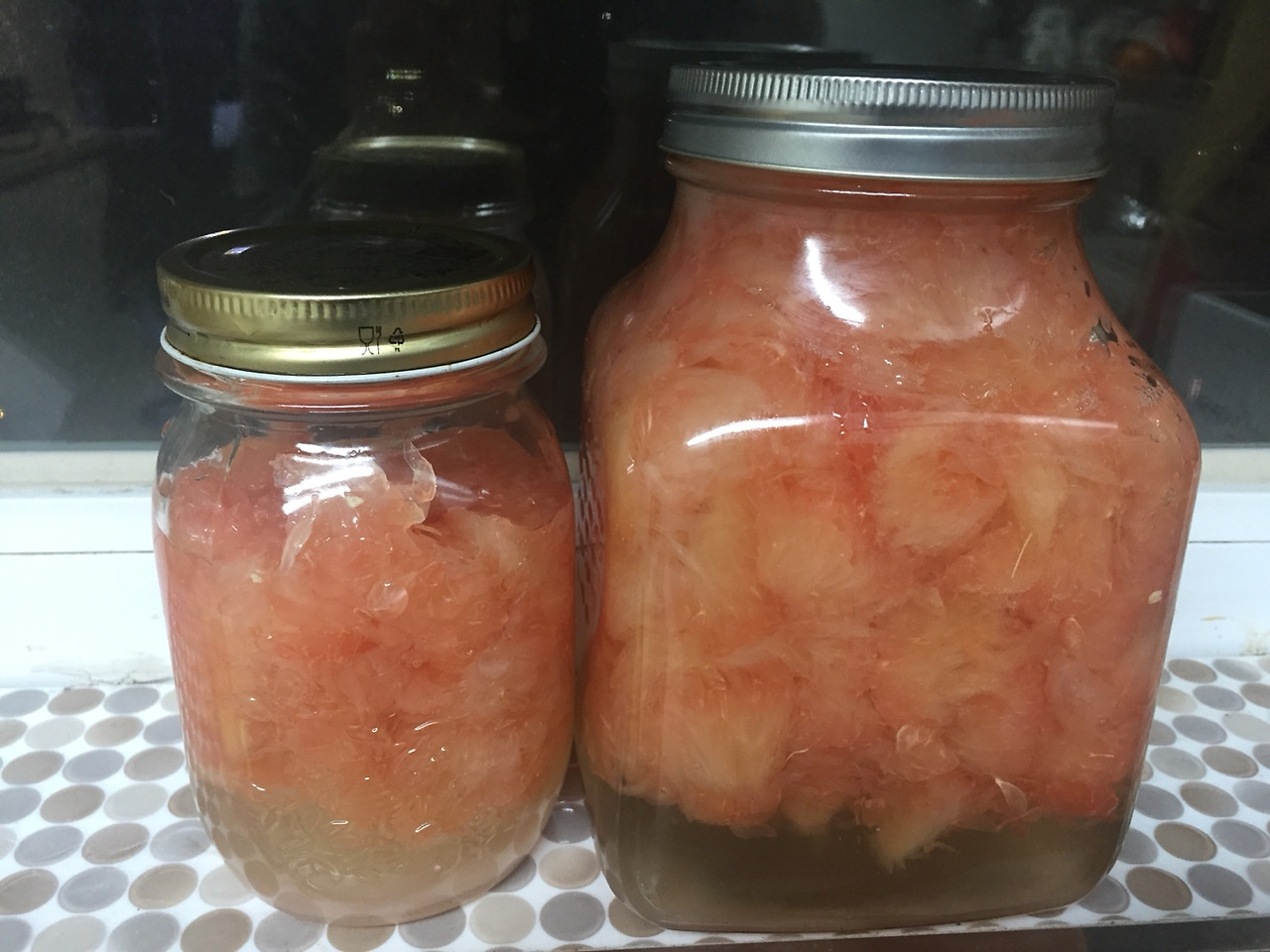 카페에서 마셨던 자몽차가 너무 맛있어 자몽청을 한 병 주문해 사 가지고 왔다. 집에 가져온 지 며칠 안돼 순삭! 한 번 담가볼까 하는 생각에 자몽 10개를 샀다. 두꺼운 겉껍질을 벗겨내고 겹겹이 싸여있는 씁쓸한 하얀 속껍질을 제거하고 나면 말알갛고 빨간 속살이 알알이 얼굴을 내민다. 첫 번째, 두 번째, 세 번째 자몽....겉껍질, 속껍질, 자몽 과육. 이것도 일이라고 반복할수록 솜씨가 나아진다. 수북이 쌓인 자몽 과육을 보며 먹기도 전에 흐뭇함으로 입안이 달달해진다. 병을 깨끗이 소독하고 적당량의 과육과 설탕을 담아 자몽청을 완성했다. 뚜껑을 닫아 창틀에 올려놓으니 만족감에 저절로 두 손이 가슴께로 모아진다. 그렇게 자몽청 담그기에 맛들려 벌써 오늘로 세 번째의 자몽청을 담갔다. 음식 만드는 것에 취미가 없는 나지만 애들이 맛있게 먹는 모습을 보면 이 맛에 만드나 싶은 생각도 든다. 조금 한가하니 이런 것도 할 생각을 하는구나 싶었다. 공식적 나의 비수기 덕분에....