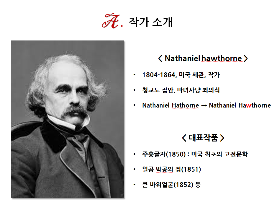 너새니얼 호손은 작가로서의 꿈을 키운 지 25년 만인 1850년, 소설 『주홍 글자』를 발표한다. 군인, 정치가, 치안판사 등으로 식민지 시대에 크게 명성을 떨치던 선조들의 후손이면서도, 하고많은 직업 중 작가를 선택한 것에 대해 오래전부터 비난을 받아 오던 그였기 때문에 ‘낙양의 지가를 올릴 작품’이 무엇보다도 절실하던 시기였다. 그동안의 인고의 시간을 보상이라도 하듯 『주홍 글자』는 미국 문단에 커다란 파장을 일으키며 놀라운 성공을 거둔다. 열정적이고 자유로운 성격의 헤스터 프린과 학구적이고 예민한 딤스데일 목사의 사랑은 당시 청교도 사회뿐 아니라 최근에 와서도 ‘역겹고 음란한 사랑’이라는 평가를 받으며 『주홍 글자』를 금서로 지정하자는 등의 수난을 당하기도 하지만, 호손이 작품 속에 사용한 치밀한 구성, 밀도 있는 문장 스타일 등은 문단에서 열렬한 지지를 받아 왔다. -yes24 참고-