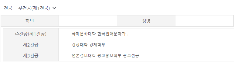 제가 다녔던 대학교는 현재 자퇴한 상태이고 제 학적을 보면 아래 사진과 같이 한국 언어 문학, 경제학, 광고홍보학 이렇게 3개의 과를 다중 전공해놓은 상태로 남아있습니다. 전공이 3개라니.. 특이하죠?
