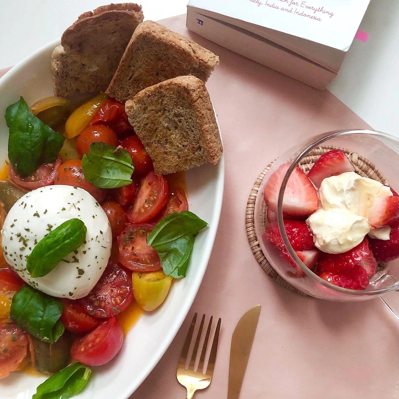 오늘은 내내 먹고 싶었던 토마토를 베이스로 한 치즈 샐러드를 해 먹기로 결심했다. 배가 찰까 걱정했는데 생각보다 든든한 양이었다. 후식으로 요즘 내가 빠진 딸기와 크림치즈, 꿀도 놓았다. 바질의 향긋함과 치즈의 고소함, 토마토의 식감이 더해져 만족스러운 한 끼를 먹었다.