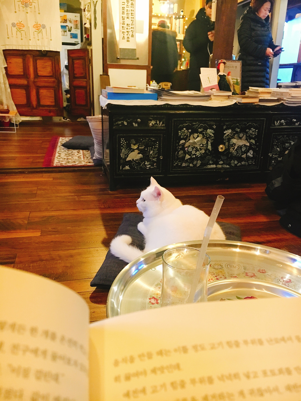비 오는 날은 ‘책다방’이 제격이다. 해일리가 처음 온 날 혼자 책다방에 있다길래 쪼르르 가서 함께 책을 읽었다. 아직 안면만 튼 정도였지만 그냥 새로 왔다는 언니와 친해지고 싶었다. 책다방은 방석에 앉아 책을 읽는 좌식 카페인데 이리저리 자세를 바꾸다가 나중엔 거의 눕다시피ㅋㅋㅋ 했다. 하얀 고양이가 이 곳의 트레이드마크다. 밖에 있는 화장실 가려고 문 열 때마다 냙! 하면서 빛의 속도로 튀어나가려고 해서 주인아주머니가 아주 땀 빼셨다. 기억은 잘 안 나지만 뭔가 내 알아서 살 건데요? 하는 류의 책을 읽었던 것 같다. 날이 흐려서 아침부터 쓸쓸했는데 책다방 분위기가 좀 마음을 달래줬다.