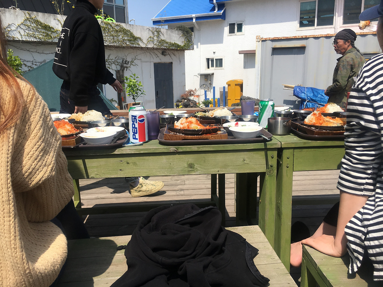 스텝들이 단체로 뭘 먹으러 나간다 싶으면 십중팔구 '멘도롱돈까스'였다. 또 열에 아홉은 '눈꽃 치즈돈가스에 매운 소스 추가요!'를 외쳤다. 진짜 웃긴 건 음식이 나오면 다들 소스 뿌리는 의식(?)을 찍겠다고 난리가 난다. 그리곤 꼭 누가 제일 예쁘게 소스를 뿌렸는지를 평가했다. 게스트 분들이 맛집을 물어보면 항상 '멘도롱..!'이라는 말이 목까지 나왔는데, 제주도까지 와서 돈가스 먹고 가라 하기가 뭐해서 삼키곤 했다.
