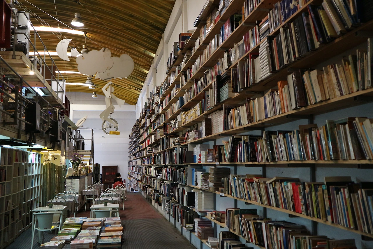 책을 구경하며(여기선 읽을 수 없으니 구경할 수밖에) 위로 올라갔다. 2층엔 카페가 있고, 창마다 소파가 놓여있었다. 소파에 앉아 잠시 쉬며 서점을 한번 더 둘러봤다. 한층 위엔 서점에 어울리지 않는 기계가 있었다. 이전에 있던 섬유공장의 흔적 같아 보였다. 책과 전혀 관련 없어 보이는 물건들을 보며 이상하다고 생각하던 차에 한 노인이 "영어할 줄 아니?"라고 물어왔다. 그러더니 대뜸 내 앞에 있던 여자와 함께 따라오라고 말했다. 영문을 모른 채 우리는 노인을 따라갔다. 그는 달을 향해 올라가는 조형물 이름이 'dreamer'라고 알려준 뒤 ㅁ자 모양으로 길을 돌며 자신이 만든 작품들을 보여주었다. 재활용품을 이용해 만든 움직이는 놀잇감같은 것들이었다. 처음엔 그저 친절한 분이라고 생각했고, 설명이 길어지자 지나친 친절에 좀 의아해졌다. 그리고 역시나 마지막엔 팁으로 막을 내렸다.