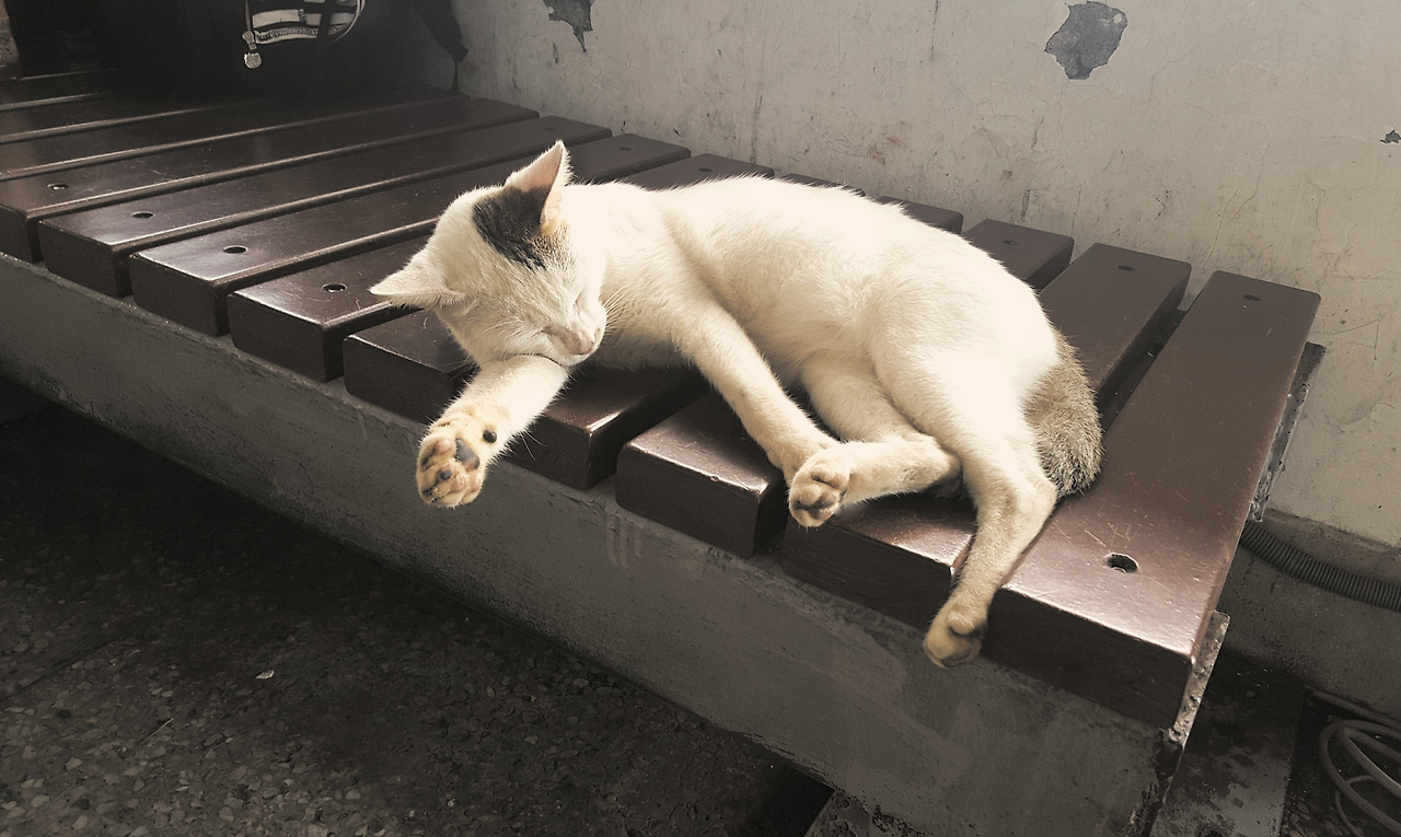 아무도 곁에 가지 않고 사진을 찍기만 했는데 한 남자가 닭날개볶음밥(?)을 먹으며 옆 자리에 슬며시 앉았다. 기척에 깼는지 고양이가 일어나서는 남자를 물끄러미 바라보았다. 한 입 내어놓으라는 눈빛을 강렬하게 쏘았지만 남자는 꿋꿋이 앞만 보고 손에 든 음식을 다 먹었다. 그가 자리를 떠나자 고양이는 체념한 듯 다시 원래 자세로 돌아와 잠을 청했다. 그 자리에 있는 어느 누구도 불편하지 않았다.