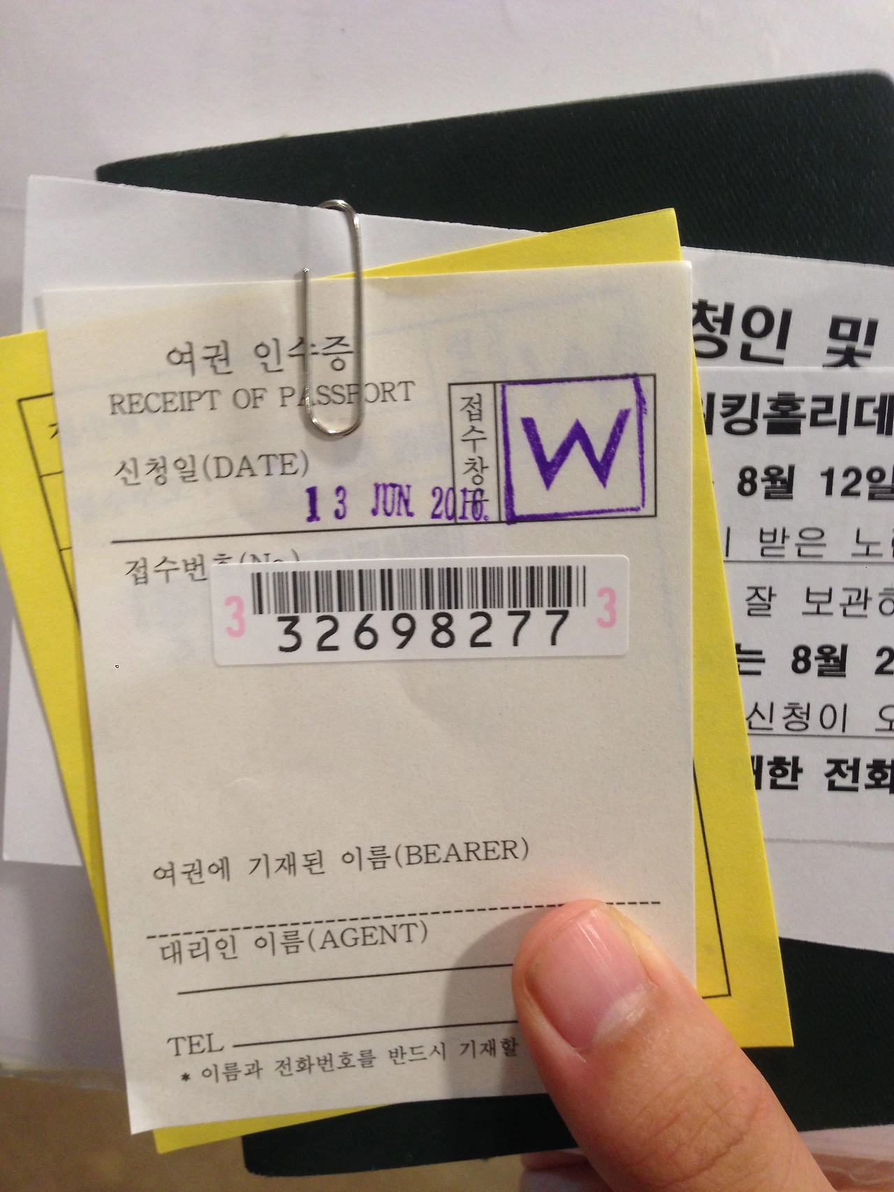 여권 인수증은 이 날, 여권을 받기 위해 필요한 종이였다.