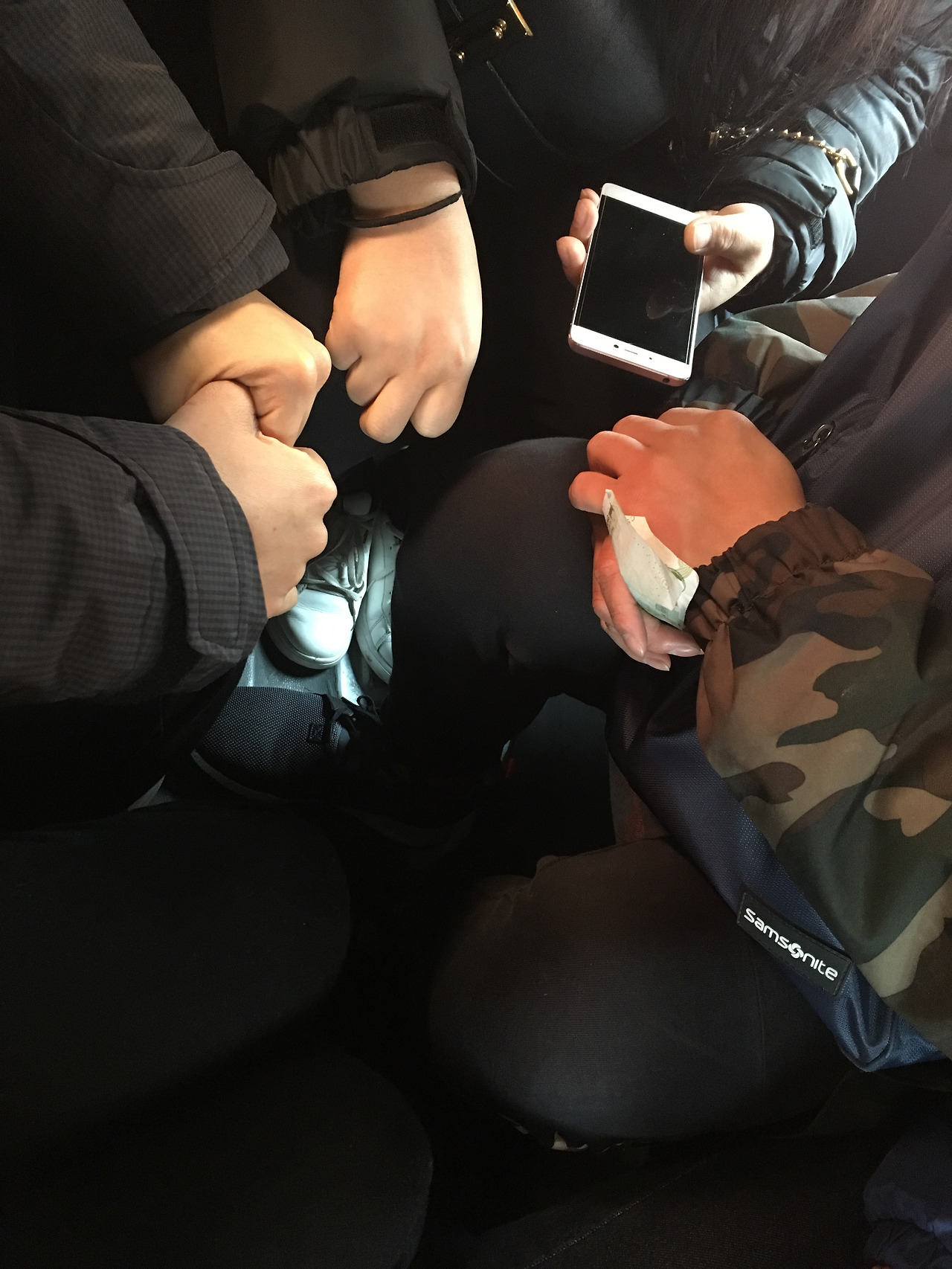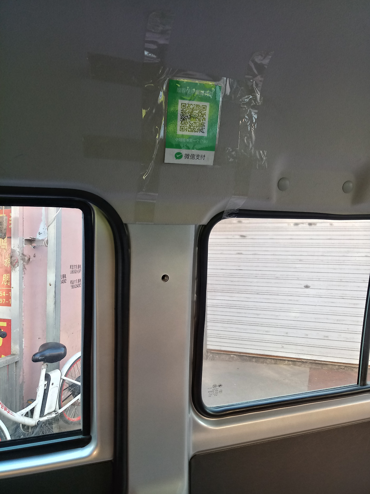 무릎과 무릎이 닿는다. 손과 팔을 움직이는 것도 쉽지 않다. 역에 도착할 때까지는 꼼짝도 못 하고 고개만 두리번거린다. 제대로 된 좌석도 없는 공간인데 묘하게 신식이다. 하나하나 올라타서 창문 사이에 붙어 있는 위챗 바코드를 찍어서 차비를 낸다.