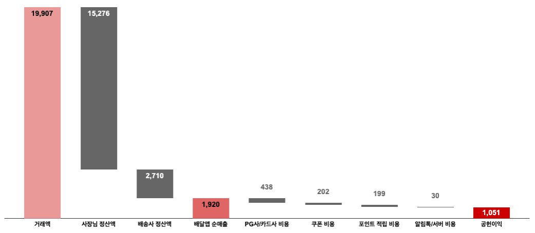 이 1,920원에서 카드결제수수료 약 2% / 쿠폰비용 200원 / 포인트 적립금 약 190원 / 그리고 주문한 치킨이 잘 오는지 궁금해하는 우리에게 알려주기 위한 카카오톡 알림톡,앱푸쉬,서버비 등에 나가는 비용 약30원을 빼고 나면[변동비], 배민에서 발생한 주문 한 건당 배달의 민족 본사에서 얻는 이익은 1,000원 내외일 것으로 추산된다.[주문당 공헌이익].(소비자 입장에서 관찰할 수 있는 비용 요소들만 정리해본 것이므로 실제로는 이익이 더 적을 가능성이 높다.)