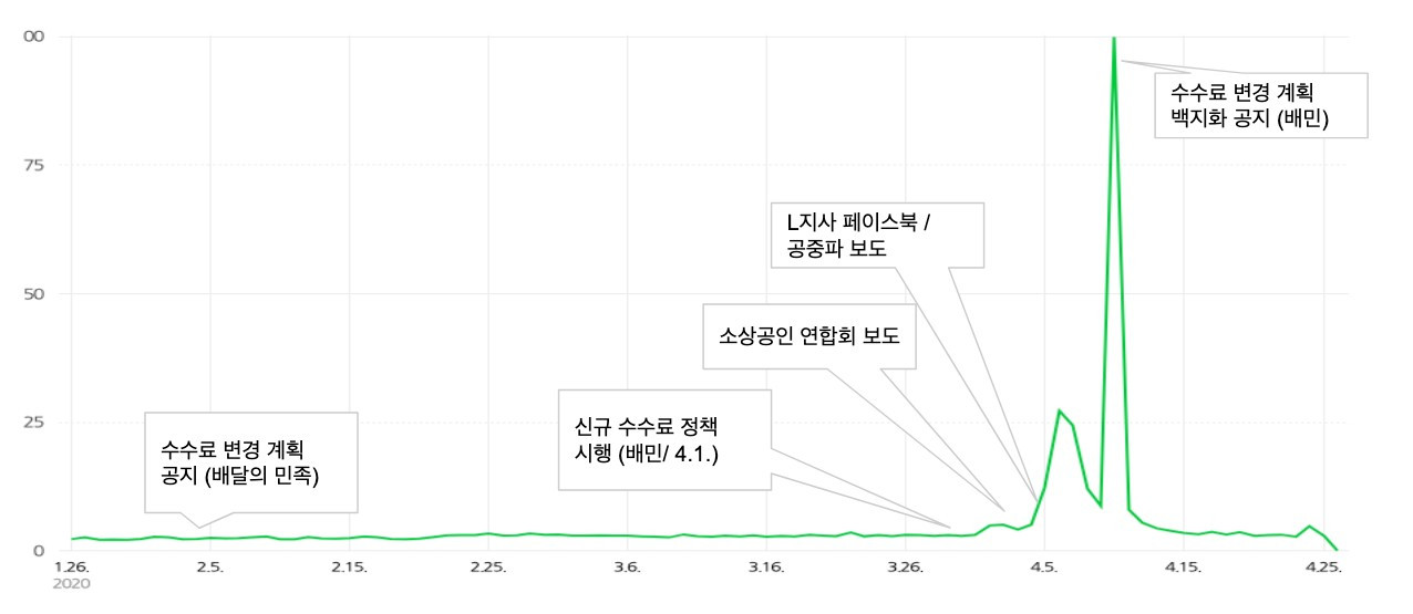 이슈가 확산된 경로를 보면. 우선 배민에서 수수료 변경안을 2월에 예고한 뒤 4월에 시행했고 (4.1) / 며칠 뒤 변경된 수수료안에 대한 소상공인연합회의 공식적인 비판이 있었다(4.3) / 이 소상공인연합회의 발표를 일부 메인 언론에서 조명하면서 많은 사람들에게 알려졌고 (4.4) / 이어서 한 행정가의 문제제기와 정치권의 강력한 비난(4.4) 및 공공 배달앱 제안까지 나온 끝에 배달의 민족에서는 수수료 정책 변경을 백지화(4.10)했다.