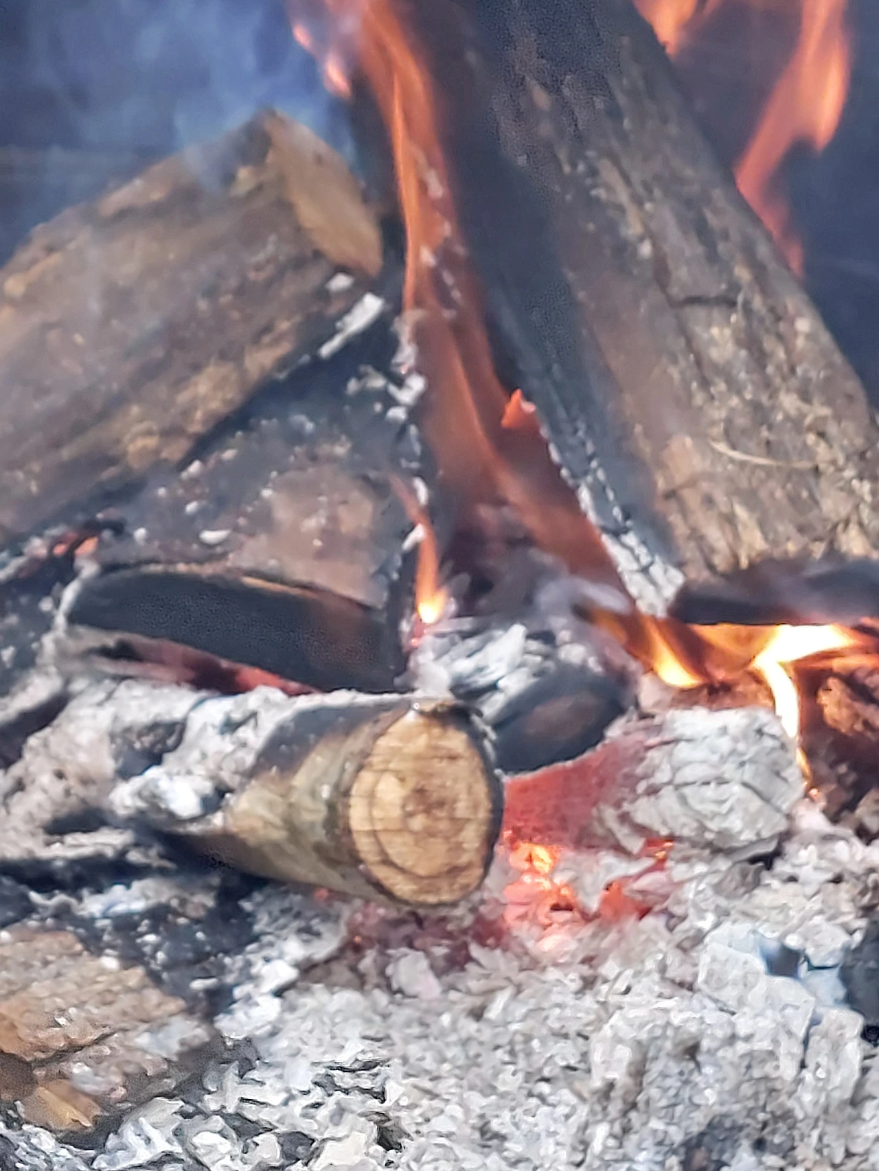 백숙을 끓이면서 장작불 앞에 작은 의자
