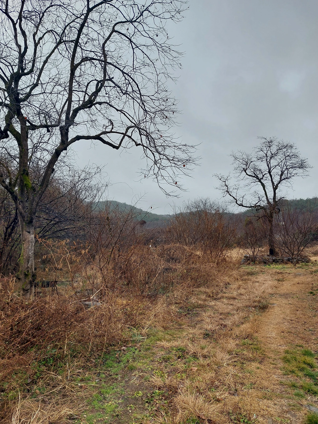 마른 잡초길을 걸으며 산책길을 나서는
