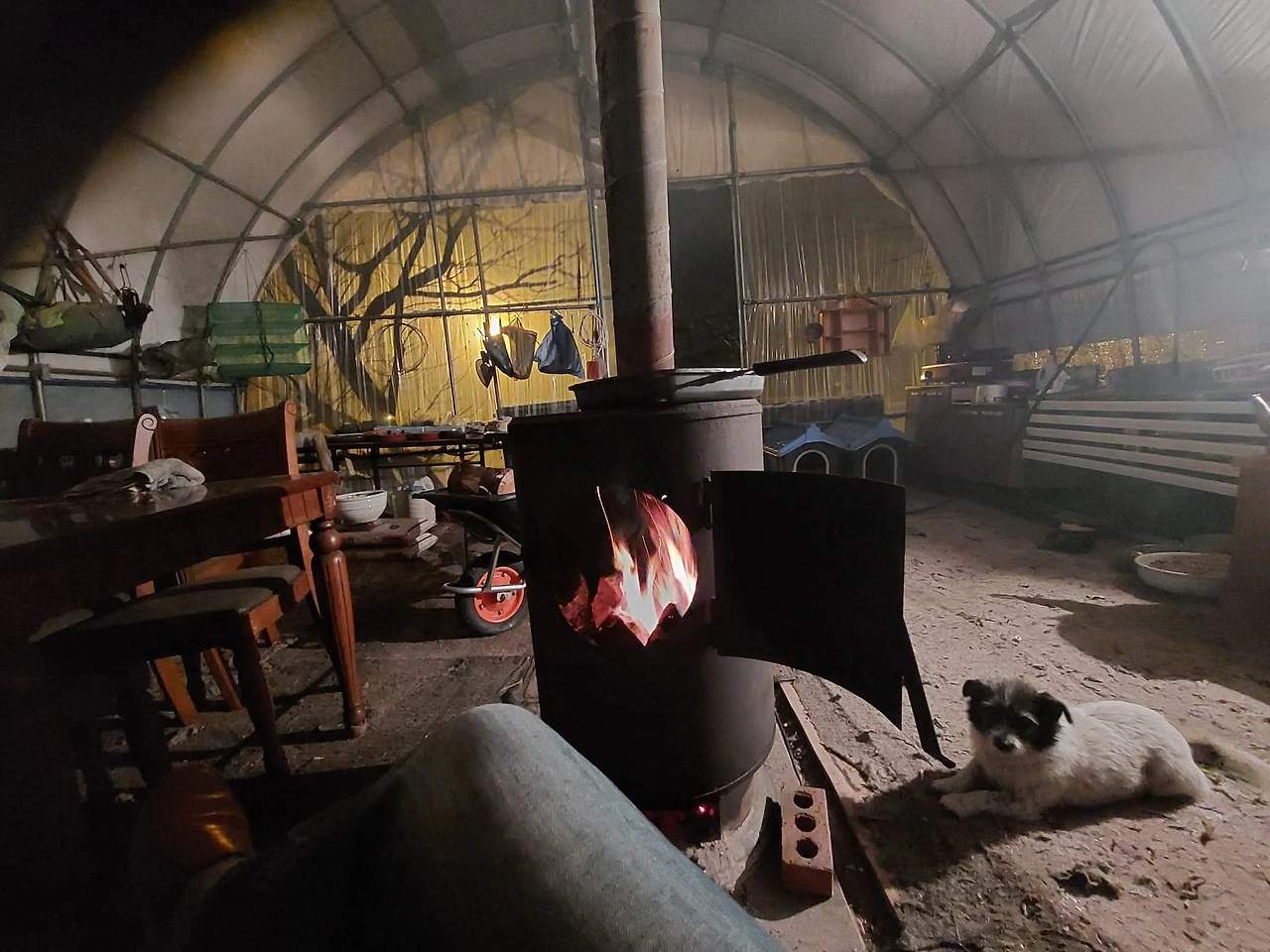 쉼터의 화목난로 앞에서 보내는 날들이