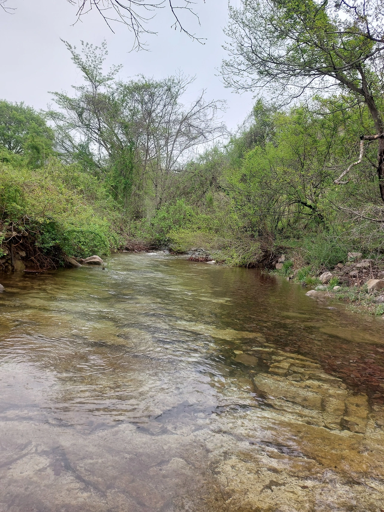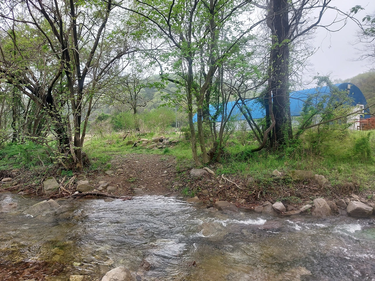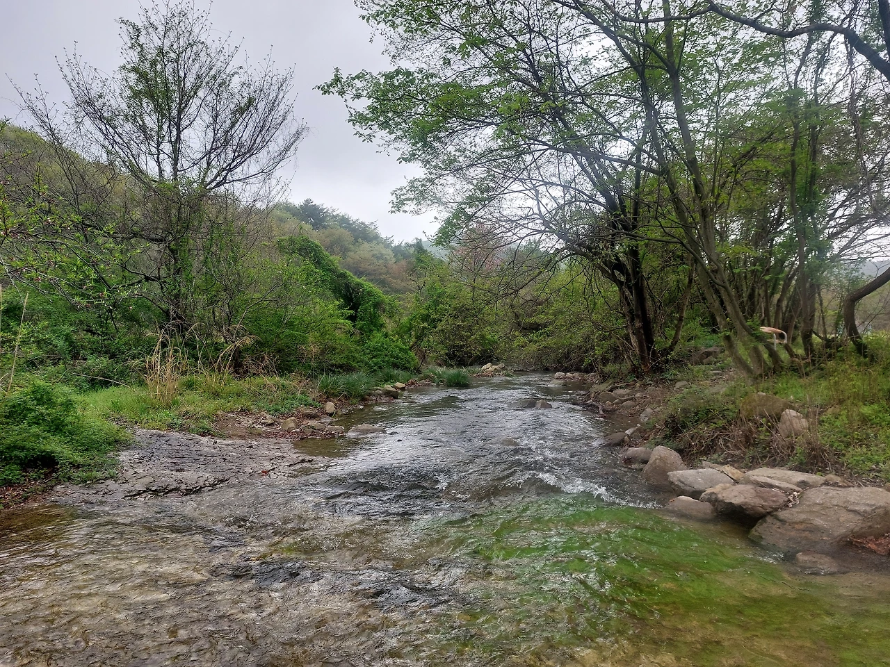 그늘이 진 냇가의 바위에 앉아서 한가로
