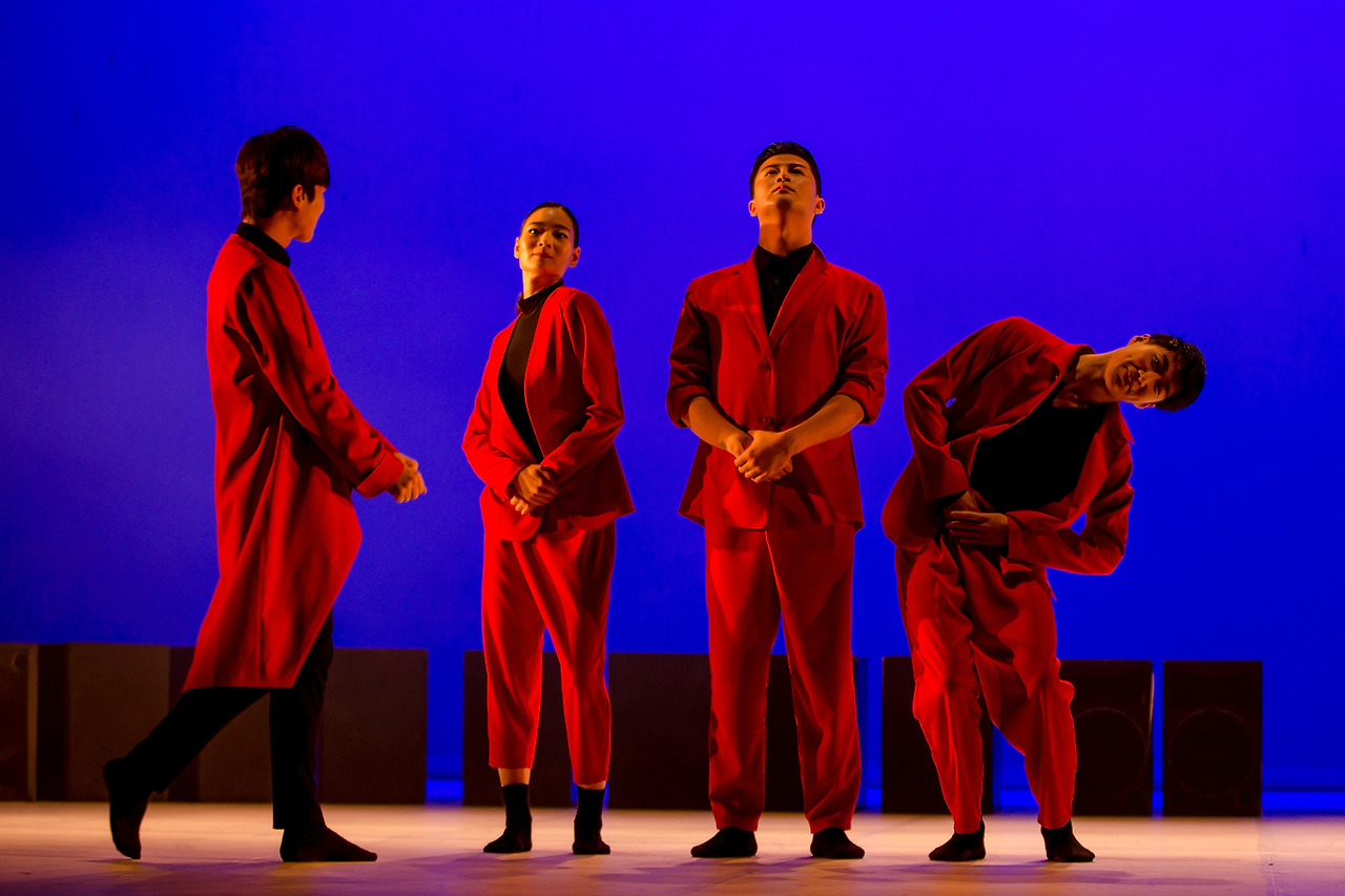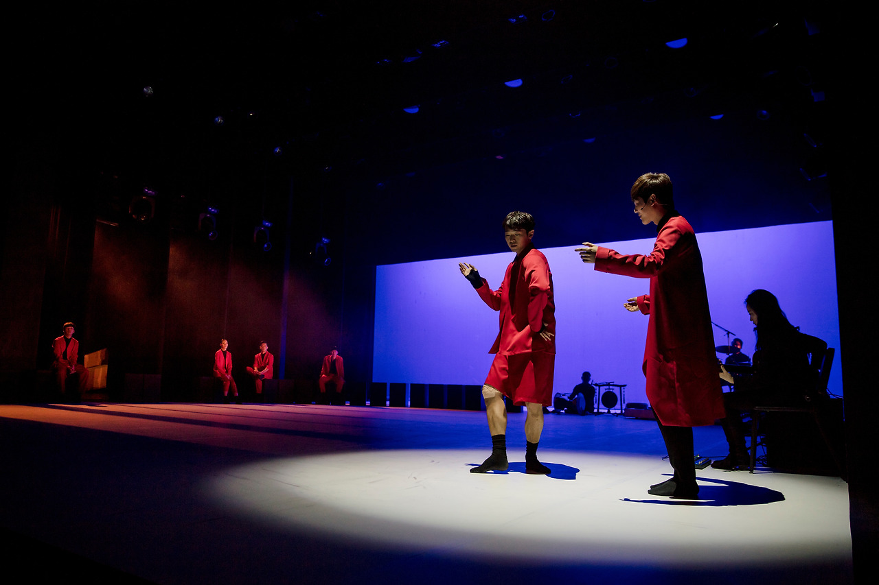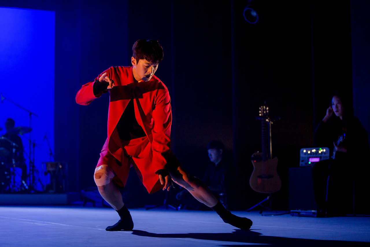 붉은 조명이 밝혀진 무대 한쪽에 쌓인 박스 위에서 여성 무용수가 홀로 장단에 몸을 맡기고 있다. 새하얀 맨투맨 혹은 후드 티셔츠에 운동화를 신은 무용수들이 하나둘 무대에 등장한다. 이들은 가만히 있으려고 노력하지만, 몸은 이미 리듬을 타고 들썩이고 있다. 한눈에 보기에도 ‘젊음’을 표방한 무용수들은 마치 팝이나 록 음악을 즐기듯이 장단에 어울려 논다. 젊은 세대가 우리 전통을 향유하는 방법은 이런 것이라는 듯이 말이다. 자칫 식상할 수 있는 이 풍경을 흥미롭게 만드는 것은 드럼, 베이스, 기타 등 밴드 편성의 연주와 텐션을 자극하는 무용수들의 테크닉이다. 이들은 올려다보기에도 아찔한 위치에서 몸을 던지거나 공중제비를 돌며 관객이 긴장의 끈을 놓지 못하도록 만든다. 불안정한 형태의 오브제와 붉은색 조명, 이와 대비를 이루는 순백색 댄스 플로어와 의상이 그러한 분위기를 더욱 강화한다.