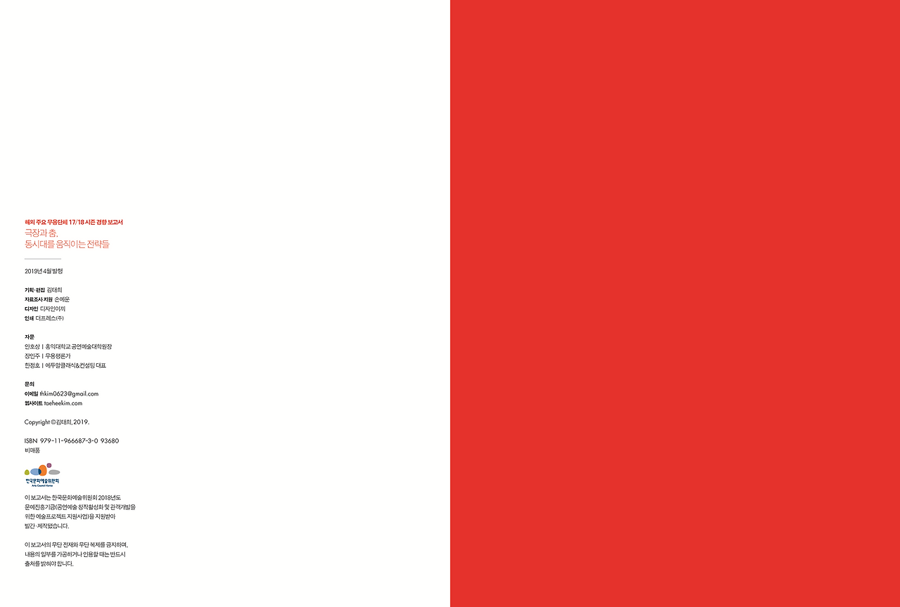 이 보고서는 한국문화예술위원회 2018년도 문예진흥기금(공연예술 창작활성화 및 관객개발을 위한 예술프로젝트 지원사업)을 지원받아 발간·제작됐습니다.
