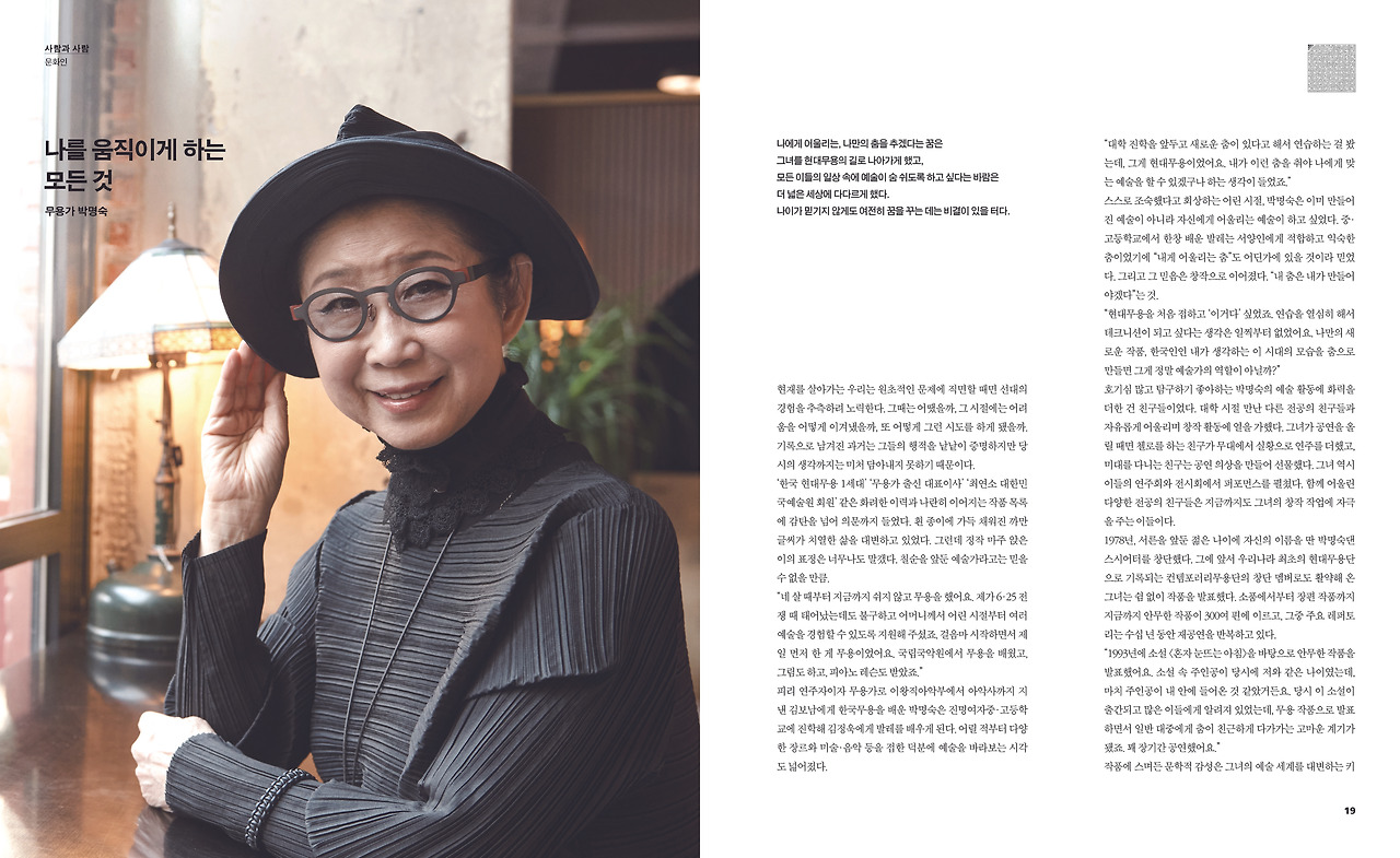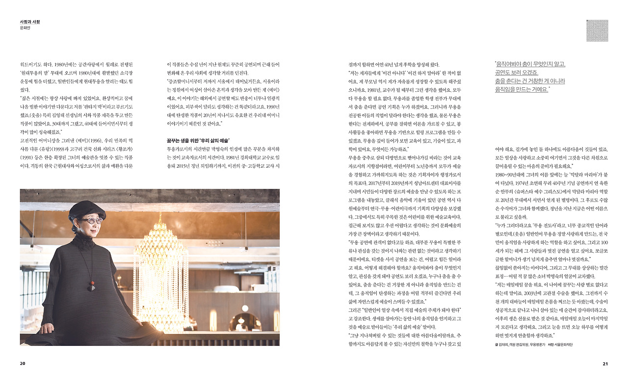 나에게 어울리는, 나만의 춤을 추겠다는 꿈은 그녀를 현대무용의 길로 나아가게 했고, 모든 이들의 일상 속에 예술이 숨 쉬도록 하고 싶다는 바람은 더 넓은 세상에 다다르게 했다. 나이가 믿기지 않게도 여전히 꿈을 꾸는 데는 비결이 있을 터다.
