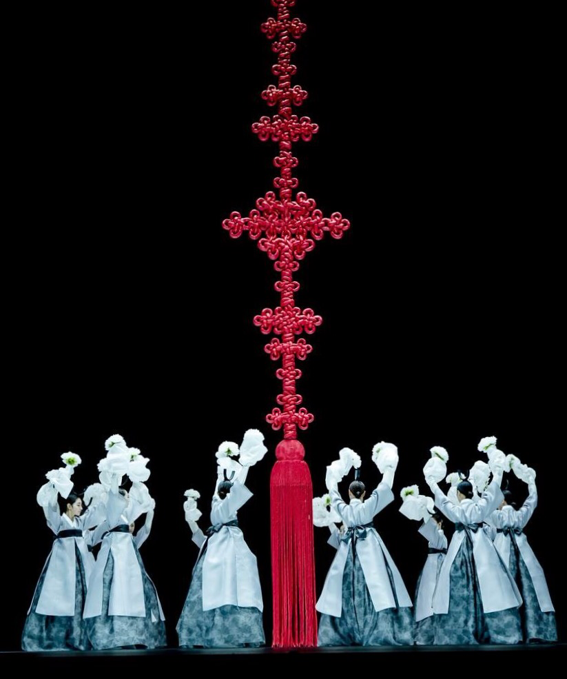 맑게 간드러진 여성 창사(唱詞)가 울려 퍼지면 같은 대열로 12명의 여성무용수가 자리한다. 모란꽃을 중앙에 두고 무동과 여령이 그 주변을 돌며 추던 춤 ‘가인전목단’을 토대로 구성한 ‘진연’이다. 모란꽃은 무용수의 손에 들렸고, 중앙에 내려온 붉은 매듭이 이들을 하나로 엮는다. 조선시대 역대 국왕 중 누구보다 춤을 사랑했고 궁중의식과 무용으로 왕실의 위엄을 자랑했던 효명세자의 뜻이 비치는 것 같다. 손끝에 들린 새하얀 모란꽃에서 시작해 동정을 따라 어깨를 지나 치맛자락까지, 화선지에 먹의 농담이 스민 듯 색이 물들었다.