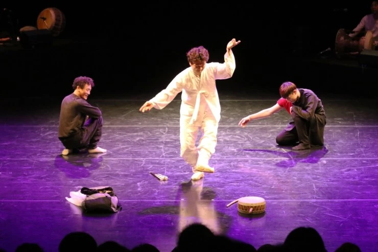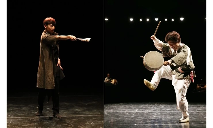 멋스러운 블랙 페도라를 쓴 김재승이 세월의 흔적이 가득 묻은 상자를 끌고 나오는 것으로 공연은 시작된다. 그 안에서 부채를 꺼내 들어 흔들기도 하고 때때로 탈처럼 얼굴을 가리기도 하는데, 장구의 두드림과 대금·피리의 울림이 조화롭게 어우러지며 흥과 애잔함이 공존하는 분위기를 만들어냈다. 부채는 우리의 전통을 대표하는 상징이자 그 안에는 예술가의 세계가 담기기도 하며, 펼침과 닫힘이 반복되며 객석과 밀고 당기는 존재다. 첫 순서를 열기 위한 훌륭한 설정이었다.
