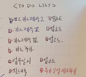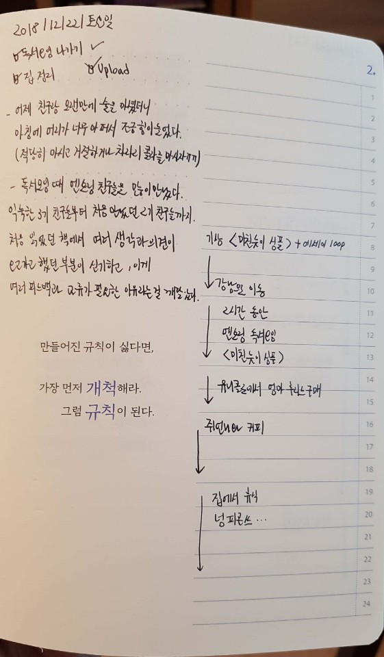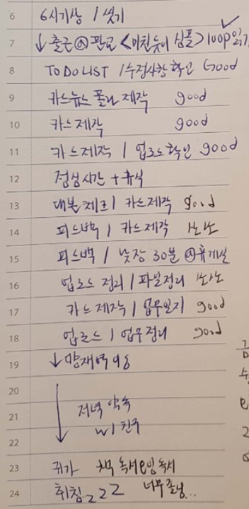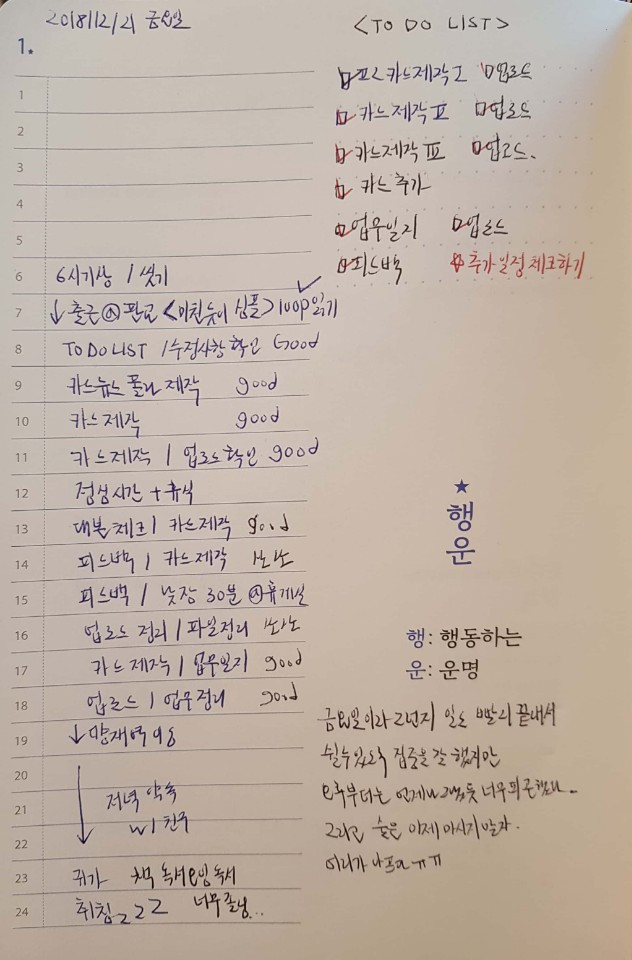 오른쪽 문구 옆 여백에 'TO DO LIST'를 적어 오늘 해야 할 일을 적었다. 주로 업무와 책 읽기에 관한 목록을 적는다. 지금 보니 조금 더 상세하게 '은행 다녀오기' 혹은 'USB 구매하기' 등 해야 하지만 잘 까먹는 일들을 적어도 좋을 것 같다. 그리고 일을 끝 마치면, 옆에 네모칸에 완료되었다는 체크를 해두었다. 별 거 아닌 것 같지만, 체크하면서 나름의 성취감도 얻는다. 만약 달성하지 못했다면 '△'세모 표시를 해놓고, 연기가 되었다면 '→'화살표 표시를 해놓는 걸 추천.