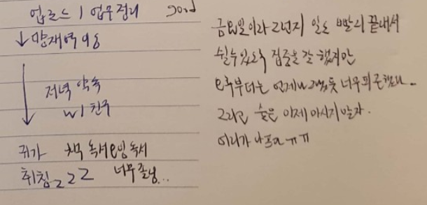 TO DO LIST를 주로 위에 쓰고 하단에는 하루 반성을 하거나 느낀 점을 몇 줄 적어 넣는다. 저 날은 금요일이었고, 솔직하게 적었다.