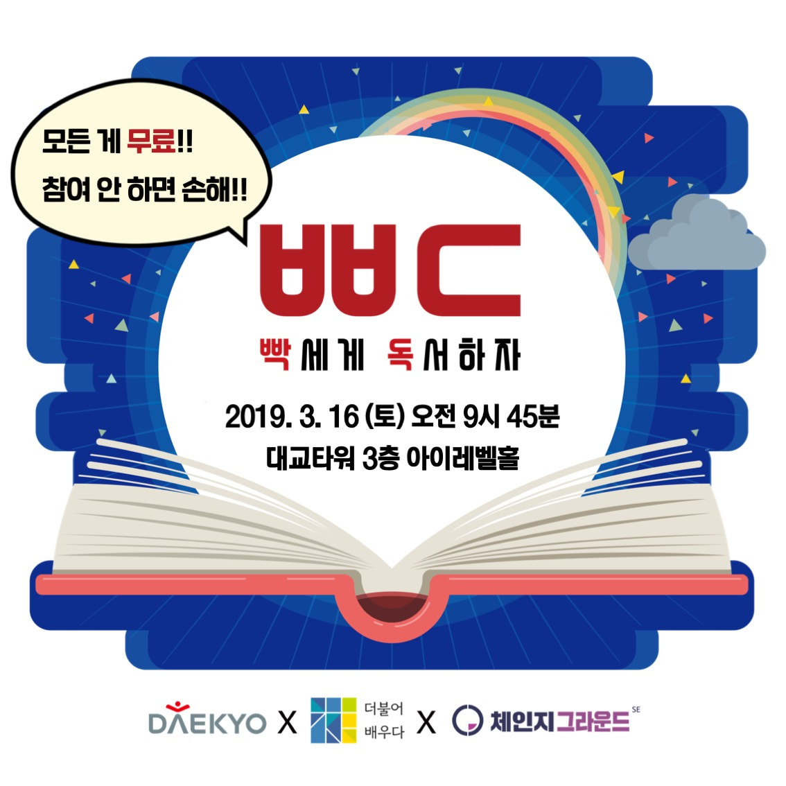 책 한 권만 들고 오세요. 간식, 점심, 저녁 모두 무료입니다. 옆에서 같이 책을 읽는 참여자들의 변화 스토리가 담긴 스피치와 강연 및 Q&A는 덤. (지난 2월 빡독에는 1700명이 신청했을 정도로.. 열기가 엄청났다.)
