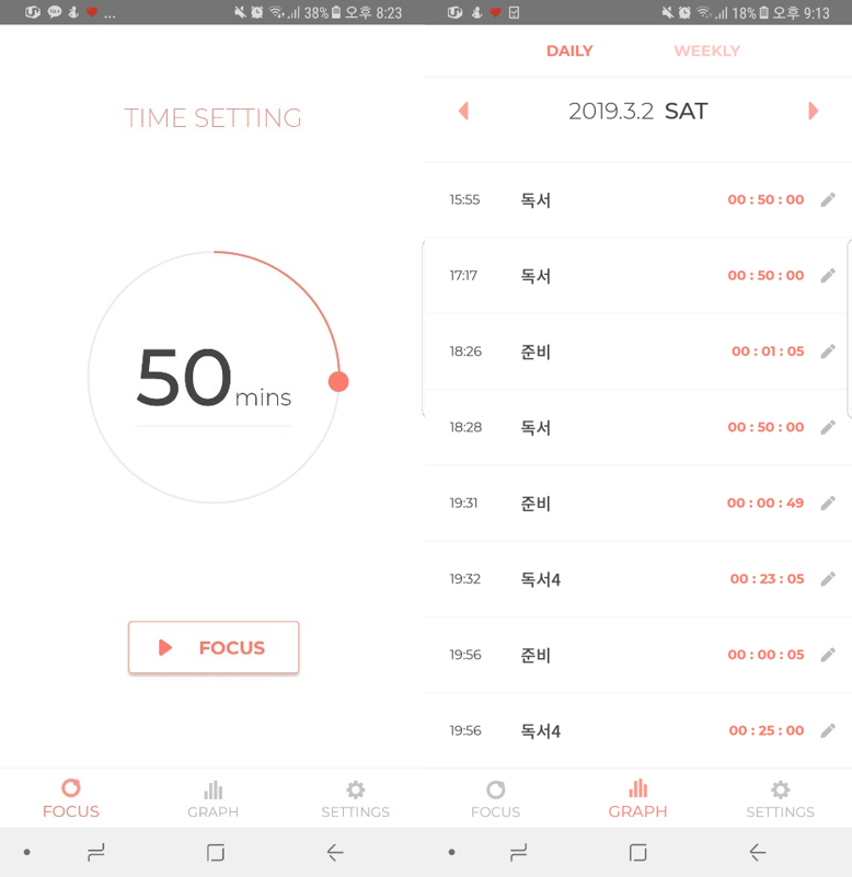 오후 4시부터 자체 빡독이 시작됐다. 우리는 비장한 각오로 지금 빡독을 하고 있다고 인스타에 포스팅을 하고, 바로 핸드폰에서 포커스 앱을 꺼내 빡독을 시작했다. 뽀모도로 공부법처럼 '집중 시간 / 휴식 시간'을 정했다. 50분 독서 / 10분 휴식. 첫 시작을 호기로웠다. 그래도 둘 다 책 좋아하고 책을 읽은 구력(?)이 있다고 생각했으니까.