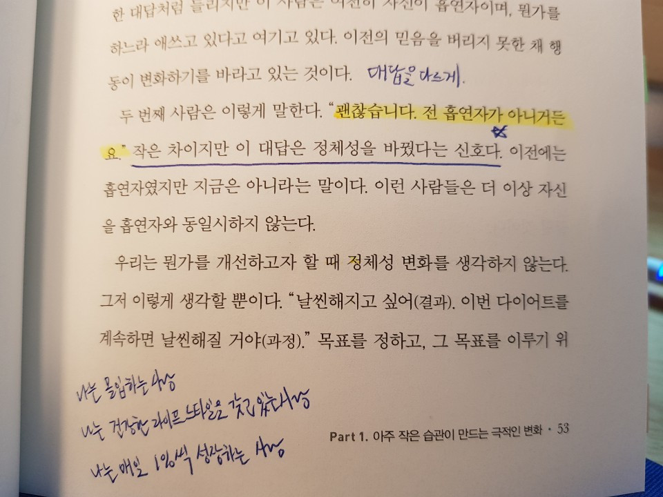 나의 목표였던 '매일 글 쓰기'도 결과 중심적 습관 형성이었다. 매일 한 편씩 꼭 써야지 하며 일주일이 넘게 고군분투하며 글을 쓰고 있다. 그러나, 무언가 하나하나씩 매일 해야 한다는 부담감이 있었다. 이 부분을 읽고 보니, 나는 정체성 형성을 먼저 하지 않았다. 그저 목표 달성에만 초점을 두고 있었다.