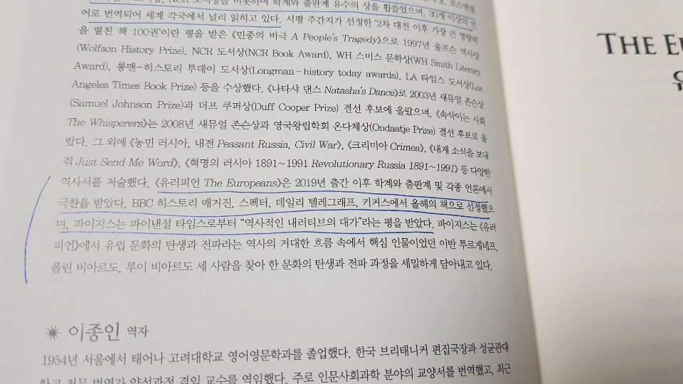 파이낸셜 타임스는 <유러피언>의 저자 올랜도 파이지스를 '역사적 내러티브의 대가'라고 극찬했다. 그가 쓴 책은 울프슨 역사상, W&H 스미스 문학상, NCR 도서상 등 각종 역사 도서상을 수상했다. 특히, <유러피언>은 2019년 출간 이후 학계와 출판계 및 각종 언론에서 극찬을 받았다. BBC 히스토리 매거진, 스펙터, 데일리 텔레그래프, 키커스에서 올해의 책으로 선정했다.
