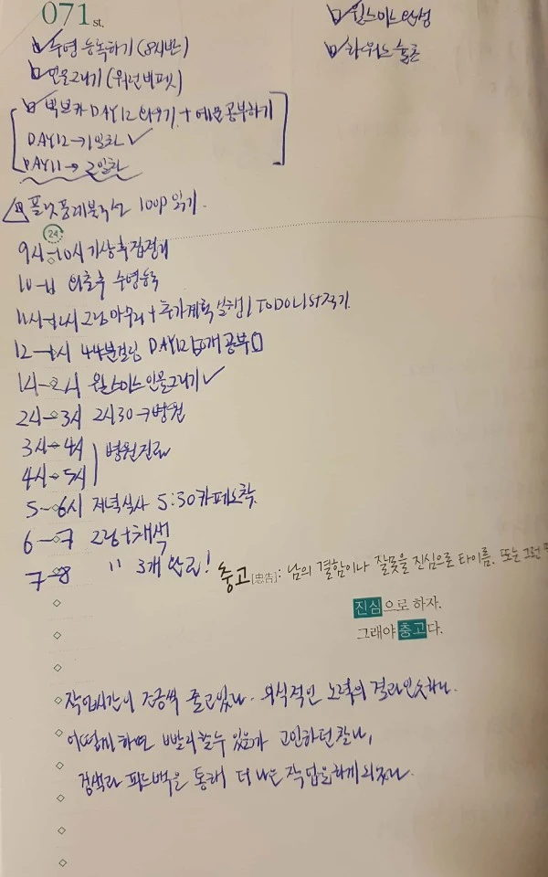 오늘 내가 반성할 점 그리고 미리 하지 못했던 부분에 대한 성찰이 주로 담겨있다.