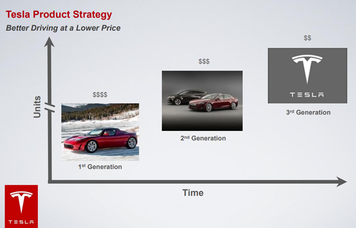 테슬라는 2014년 투자 설명회 때 아래와 같이 제품 전략을 발표합니다.