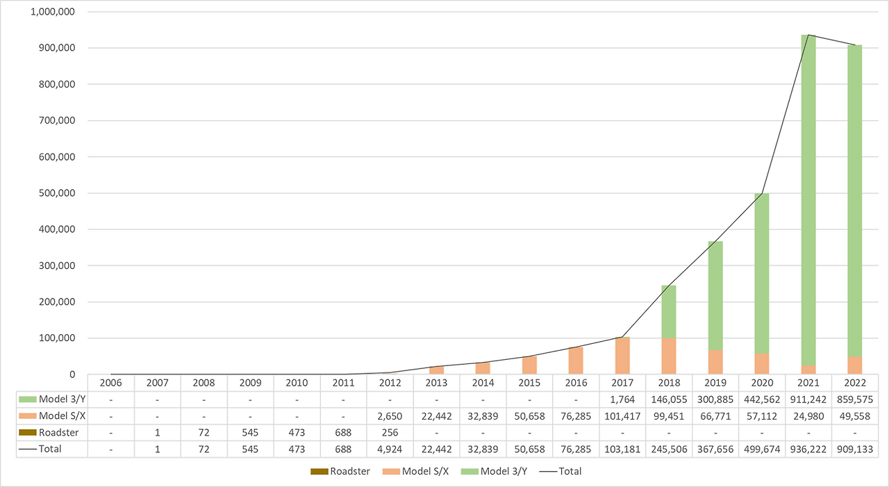 앞서 1단계는 2006년부터 2011년까지 테슬라 로드스터를 판매하던 시기, 5년이고, 이 시기 중간부터 Model S 출시 준비를 해왔습니다. 2단계는 2012년부터 2017년까지 Model S와 Model X를 판매하던 시기, 6년이고, 역시나 이 시기 내에 Model 3 출시 준비를 했습니다. 3단계는 2018년부터로 볼 수 있습니다. Model S와 Model 3 각각의 모델에서 동일 플랫폼의 Model X, Model Y가 파생되었으며 70% 이상의 부품 공용화율을 보이고, 기존 모델에서 생산성을 향상하기 위한 마이너 체인지가 이뤄졌습니다. 연도별로 Model S와 Model X, Model 3와 Model Y의 생산량을 구분하고 싶었으나, 양산 첫 해를 제외하고는 구분이 되지 않고 동일한 생산 라인에서 생산이 되기 때문에 구분하지 않았습니다.