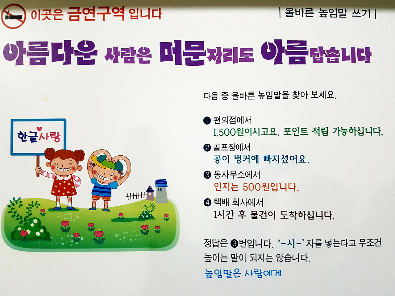 "'-시-'자를 넣는다고 무조건 높이는 말이 되지는 않습니다. 높임말은 사람에게"라고 나와있다. 잘못된 높임말을 쓰는 것을 나만 불편하다고 느끼는 줄 알았는데 이런 걸 보면 또 나만 그런 건 아닌 듯하다. 일상 속에서 잘못된 높임말을 사용하는 사람들이 많기 때문에 화장실에 이런 글이 붙어있는 게 아닐까 싶다.
