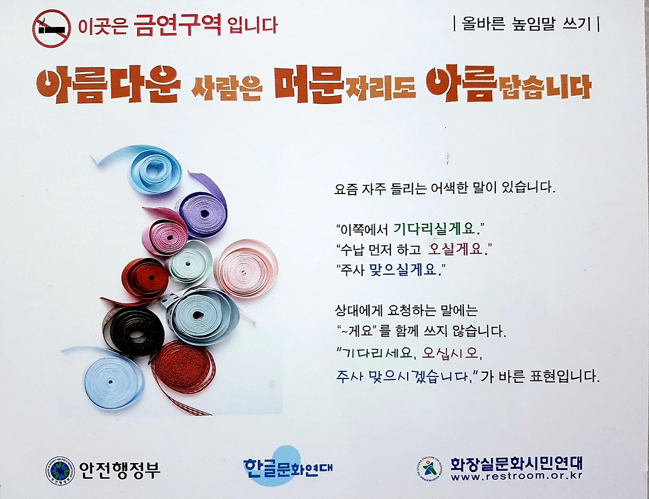 아래 사진은 공공화장실 벽에 붙어있는 것을 찍은 사진인데 올바른 높임말 쓰기에 대한 내용이다.