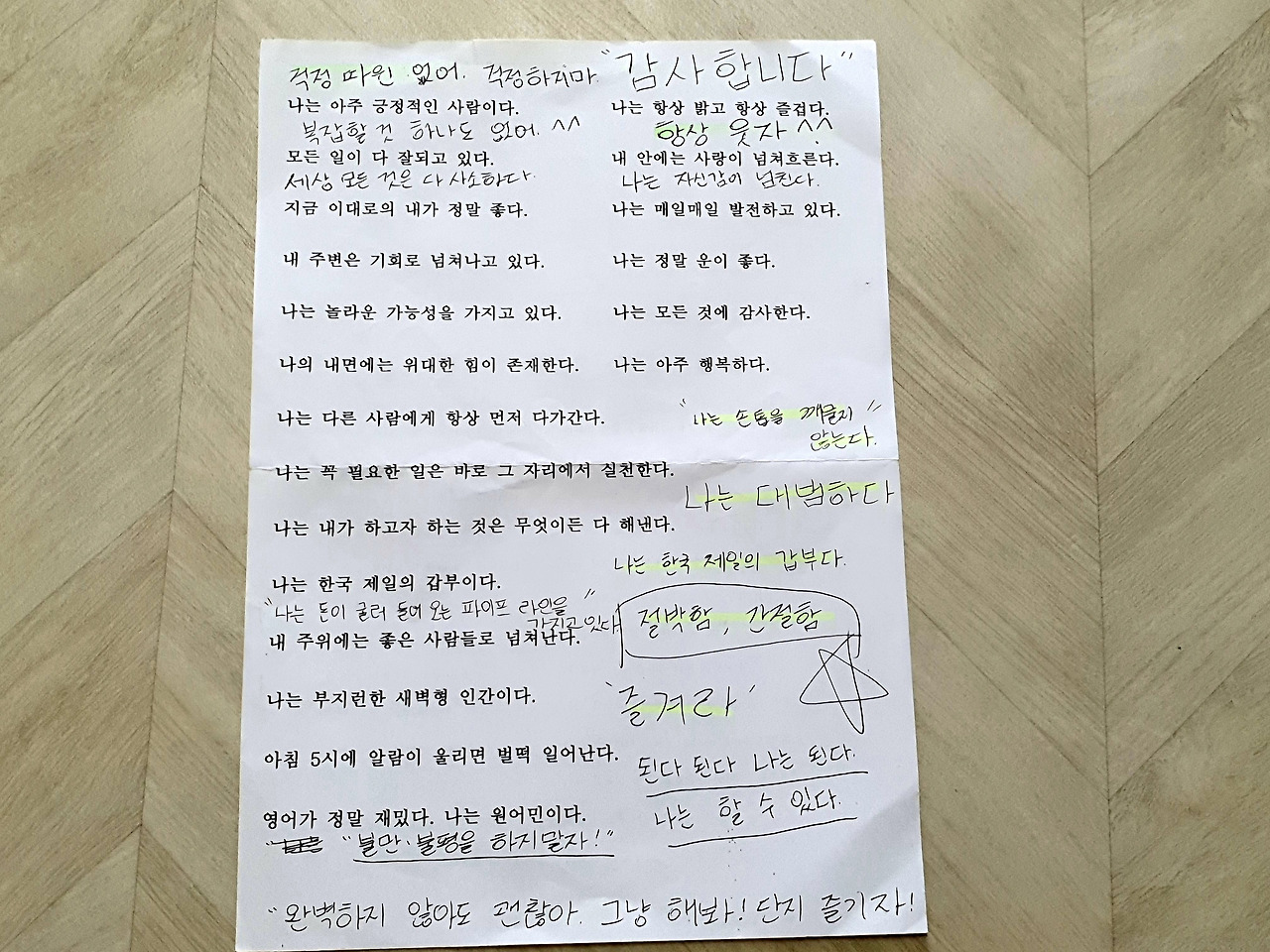 그 당시 내 방 벽에 붙여놓았던 나의 보물지도이다. 아침에 일어나면 항상 보물지도를 보며 목표를 이룬 나의 모습을 상상했다. 긍정의 말을 소리내어 읽었다. 매일 아침 5시에 일어났고 나의 목표에 한 걸음이라도 더 가깝게 다가가기 위해 부단히도 노력했다. 내 생애 가장 부지런하고 활기넘치는 시간이었다.