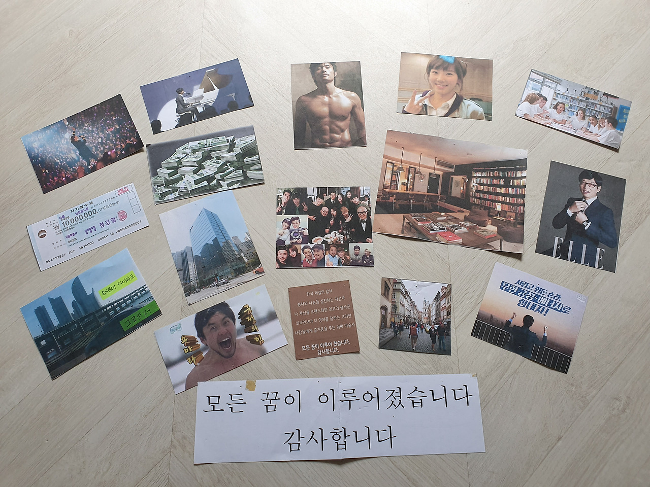 당시 보물지도에 붙여놨던 꿈들 중 몇 가지를 골라 사진으로 찍어봤다. 돈을 많이 가지고 싶다는 생각이 강했던 터라 돈, 집, 차와 같은 물질적인 것들이 많이 보인다. 그외 노래, 무대, 몸짱, 여행, 영어, 독서, 인맥, 연애, 긍정 등등 그 당시 내가 무엇을 꿈꾸고 바랐는지 잘 나타나있다.