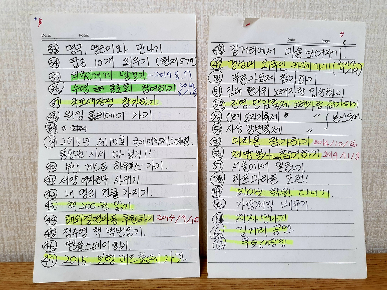 그때 적었던 63가지의 나의 꿈들을 보고 있으면 '참 욕심도 많았네.' 싶으면서도 참 열심히 살았다는 생각에 뿌듯하면서도 시도조차 하지 못한 꿈을 보고 있으면 그만큼 아쉬움 마음도 크다. 그래도 괜찮다. 지금 시작해도 늦지 않으니까.