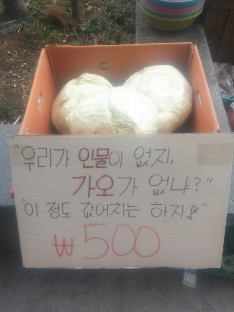 속이 갈라진 양배추를 다른 박스에 따로 옮겨 담았다. 그때 팔던 양배추가 3,000원 정도 했으니 못생긴 양배추는 단돈 500원에 팔기로 했다. 가격표에 양배추 500원이라고 단순하게 적기보다는 뭔가 색다르게 적을 필요가 있을 것 같았다. 처음엔 이렇게 적었다.