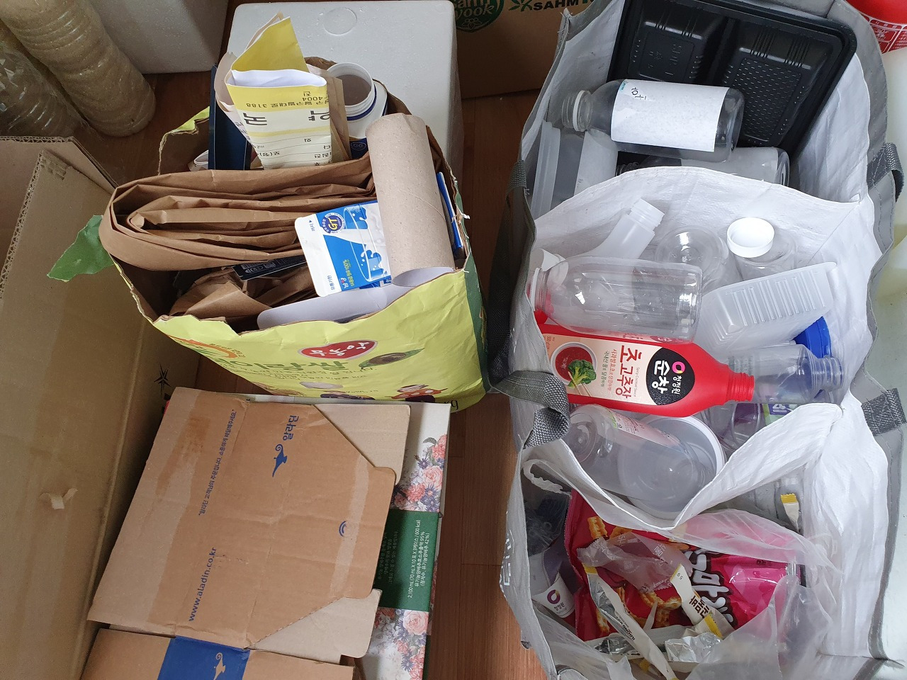 쓰레기통이 터질 정도로 꽉꽉 찬 일반쓰레기부터 비닐, 플라스틱, 종이 스티로폼, 캔 등등 한두 달만 지나도 생활쓰레기가 한가득 쌓인다. 혼자 살아도 이정도 양의 쓰레기가 나오는데 식구가 3~4명 되는 집은 오죽할까.