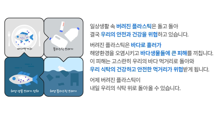 쓰레기는 버리는 것으로 끝나는 게 아니다. 썩는 데 오랜 시간이 걸릴뿐더러 해양생물에도 큰 영향을 미친다. 바다생물은 쓰레기를 먹이로 착각하고 삼키게 되면 포만감을 느껴 음식을 먹지 않다가 결국 영양실조로 죽고 만다. 새들도 미세 플라스틱을 먹이로 착각하고 삼키다가 죽기도 한다. 쓰레기는 생태계를 파괴하고 그 피해는 고스란히 사람에게 되돌아온다.