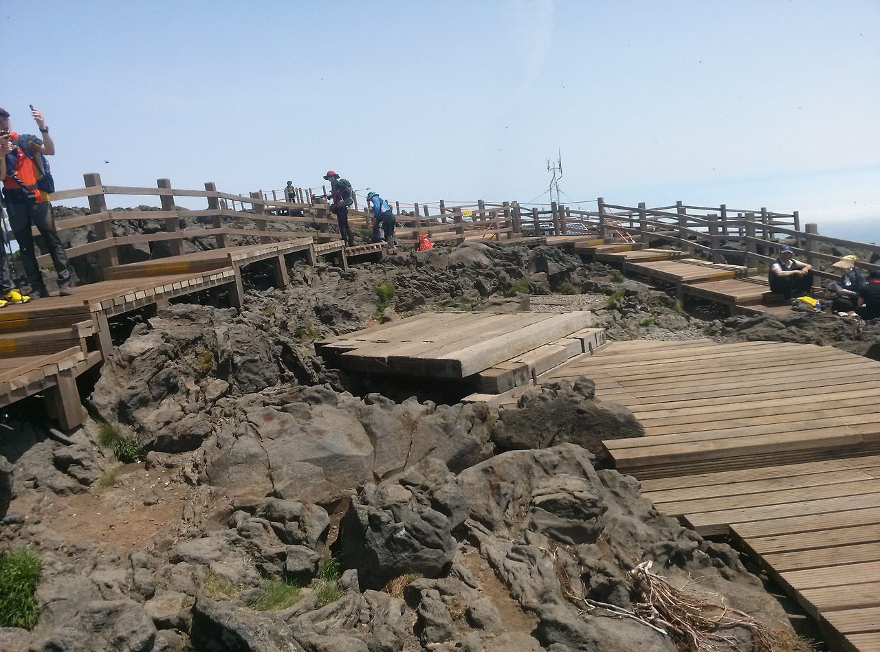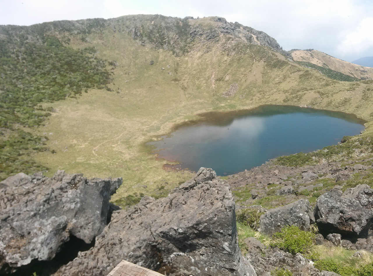 한라산 백록담이다. "물이 겨우 이것밖에 없어?"라고 생각했는데 나중에 알고 보니 이 정도면 제법 물이 많이 모여있는 거라 했다. 전날 비가 내려서 그런지 이만큼이나마 물이 고여 있을 수 있었던 듯하다.