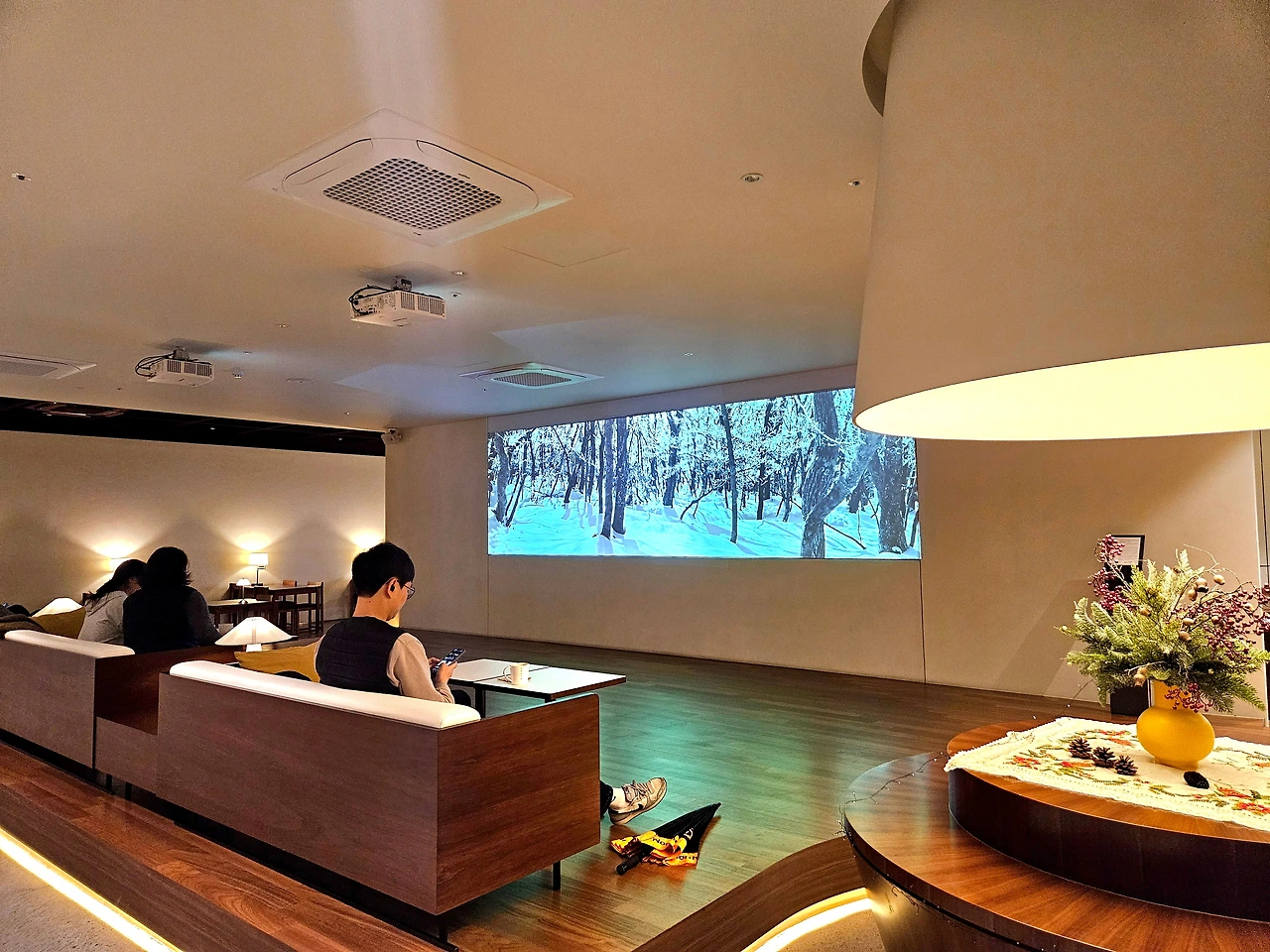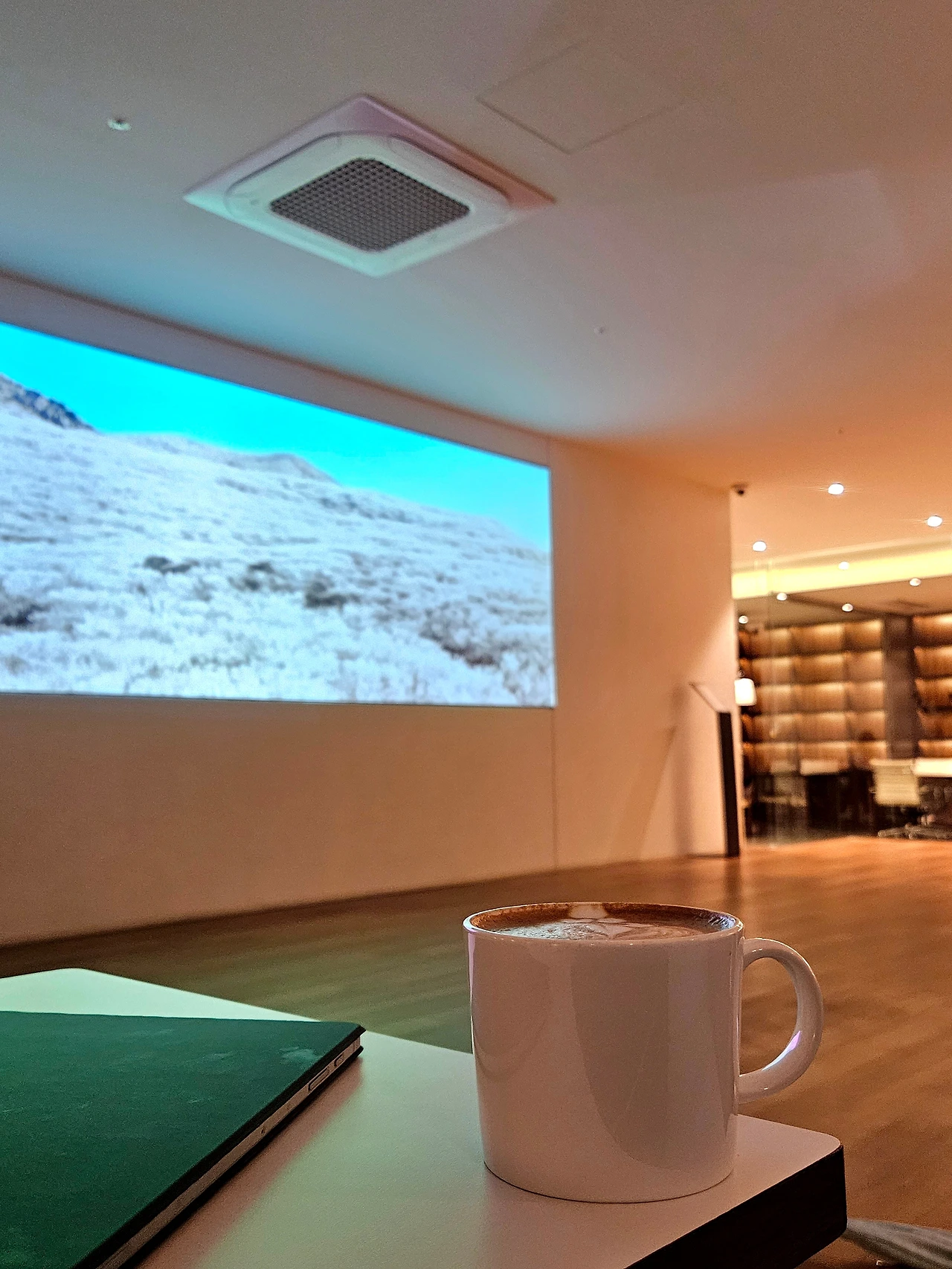 직접 가서 본 카페의 내부 모습은 기대 이상이었다. 통유리라 앉아서 비 오는 날을 즐기기 그만이었다. 적당한 자리가 하나 있었다. 앉으려고 다가가서 보니 가방이 놓여 있었다. '앗, 좀 전에 나보다 20초 먼저 들어온 그 남자군. 조금만 더 빨리 들어올걸.' 아쉬웠지만 그것도 잠깐이었다. 카페 안쪽에 들어가보니 훨씬 예쁜 자리가 많았다. 은은한 조명을 한 자리도 있었고 편안한 소파 자리도 있었다. 가히 압권이었던 건 스크린이 있는 좌석이었다. 미술관에 온 듯한 분위기였다. 잔잔한 클래식 음악이 흘러나왔다. '와우! 힐링 그 잡채잖아!'