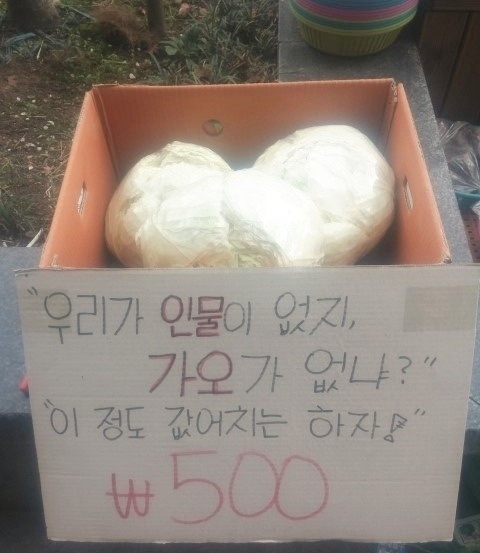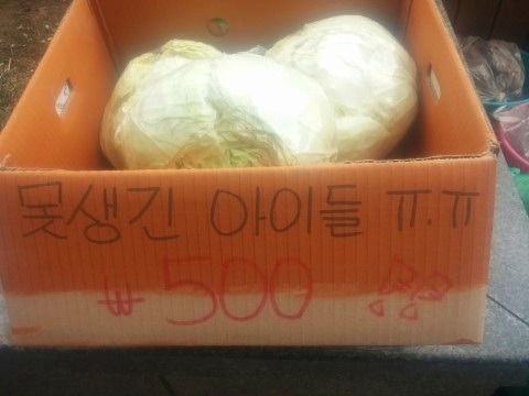 특히 기억에 남는 에피소드가 있다. 한번은 사장님이 양배추 10망을 가지고 왔다. 개수로는 30개였다. 대체로 선명한 초록빛에 속은 꽉 차 있었는데 개중에는 속이 갈라진 못생긴 양배추도 서너 개 있었다. 상품으로서 가치가 없었다. 공짜로 주기도 그렇고 버릴 수도 없었다. 일단은 거저주는 가격으로 저렴하게 팔아보기로 했다. 못난 양배추를 박스에 따로 담아 이렇게 적었다.