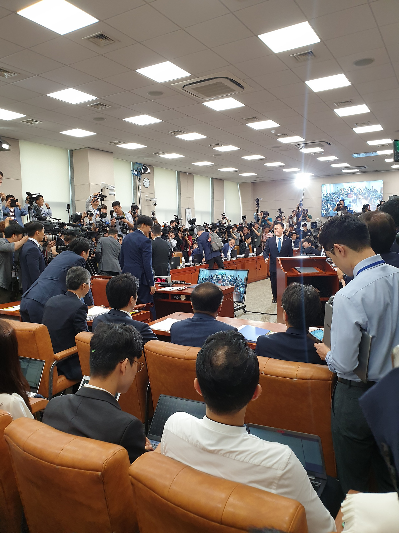 조국 후보자가 청문회장에 들어서자 더불어민주당 김종민 의원이 악수를 청하려 걸어가고 있다. 박태인