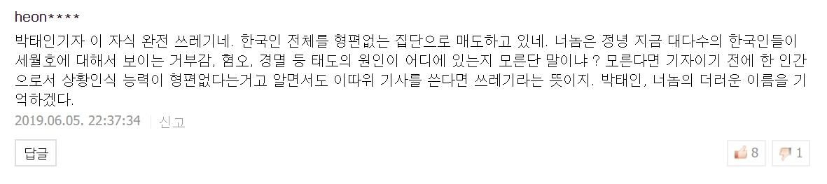 다뉴브 참사 칼럼에 한 독자가 남긴 댓글.