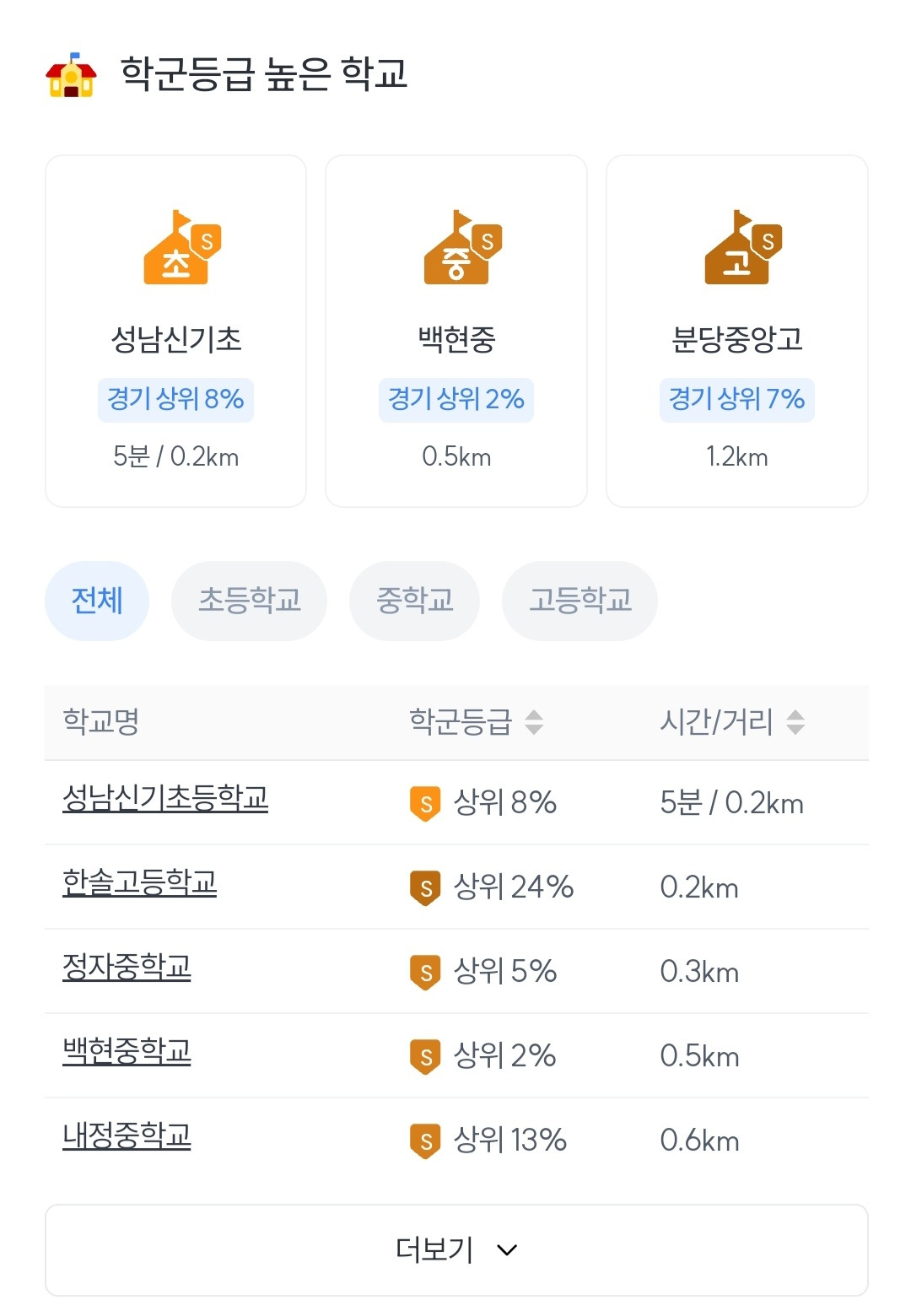 부동산 앱 '리치고'엔 흥미로운 기능이 있습니다. 아파트 주변 학군의 등급을 퍼센티지(%)로 알려줍니다. 초등학교와 중학교는 소속 학생들의 특목, 자사고 진학률을 기준으로 등급을 나누는 듯 합니다. 분당구 정자동의 한 아파트를 클릭하니 아래와 같은 결과가 나옵니다. 실제 이곳에서 학교를 다니지 않아 얼마나 정확한지는 모르지만, 모두 'S그룹'에 속한다고 나오네요. 분당 임장을 갈 때마다 중개업소 사장님들은 학군을 분당의 가장 큰 장점이라 강조합니다. 그래서 전셋값이 떨어지지 않으니 집값을 받쳐준다고도 말씀하시죠.
