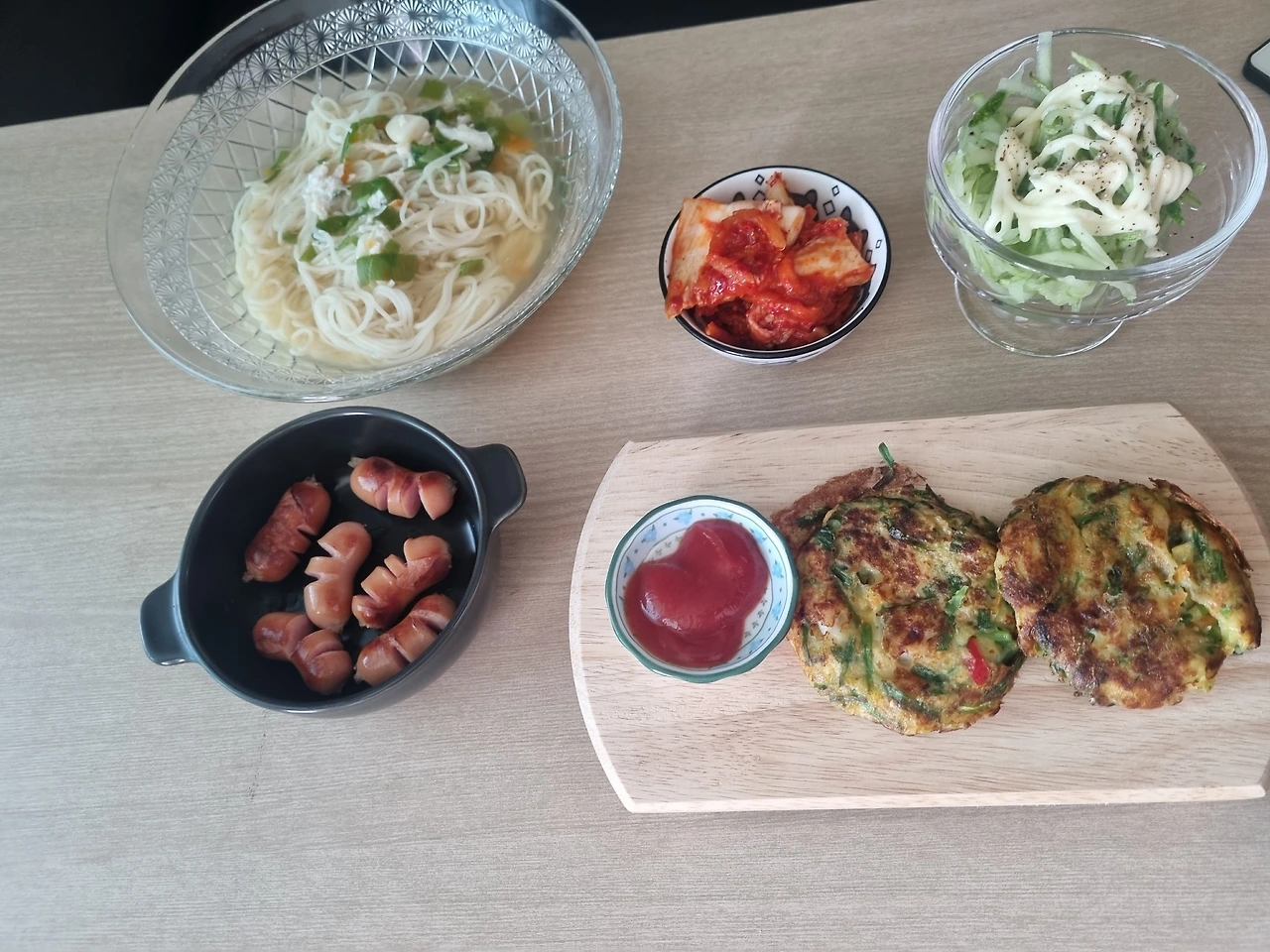 #잔치국수 #오징어새우전 #비엔나소시지 #오이샐러드 #집밥 #점심기록