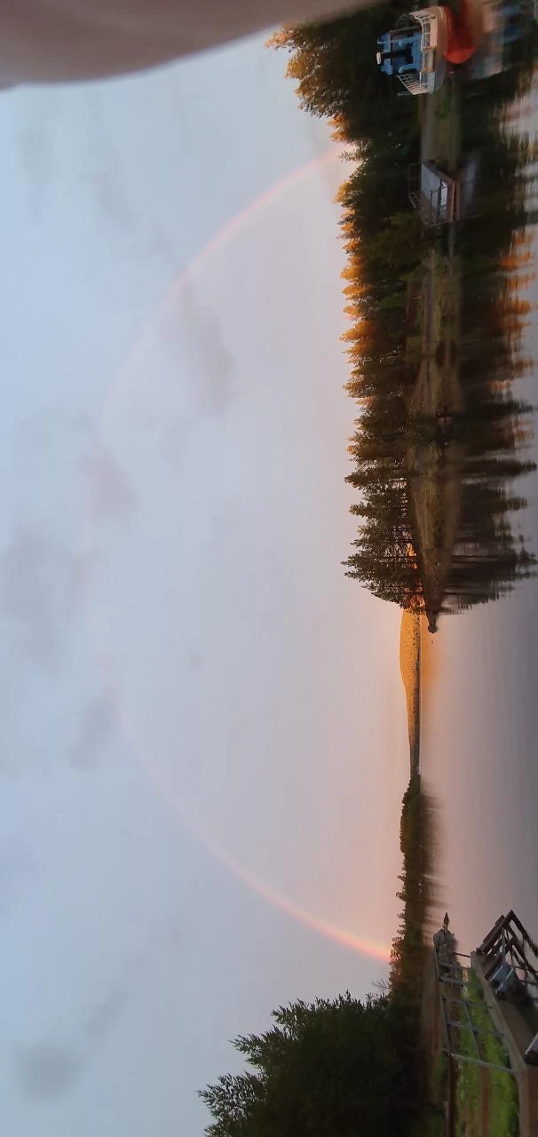 왼쪽 지평선에 걸친 태양이 은은한 조명 아래 뜬 쌍무지개. 23:10경.